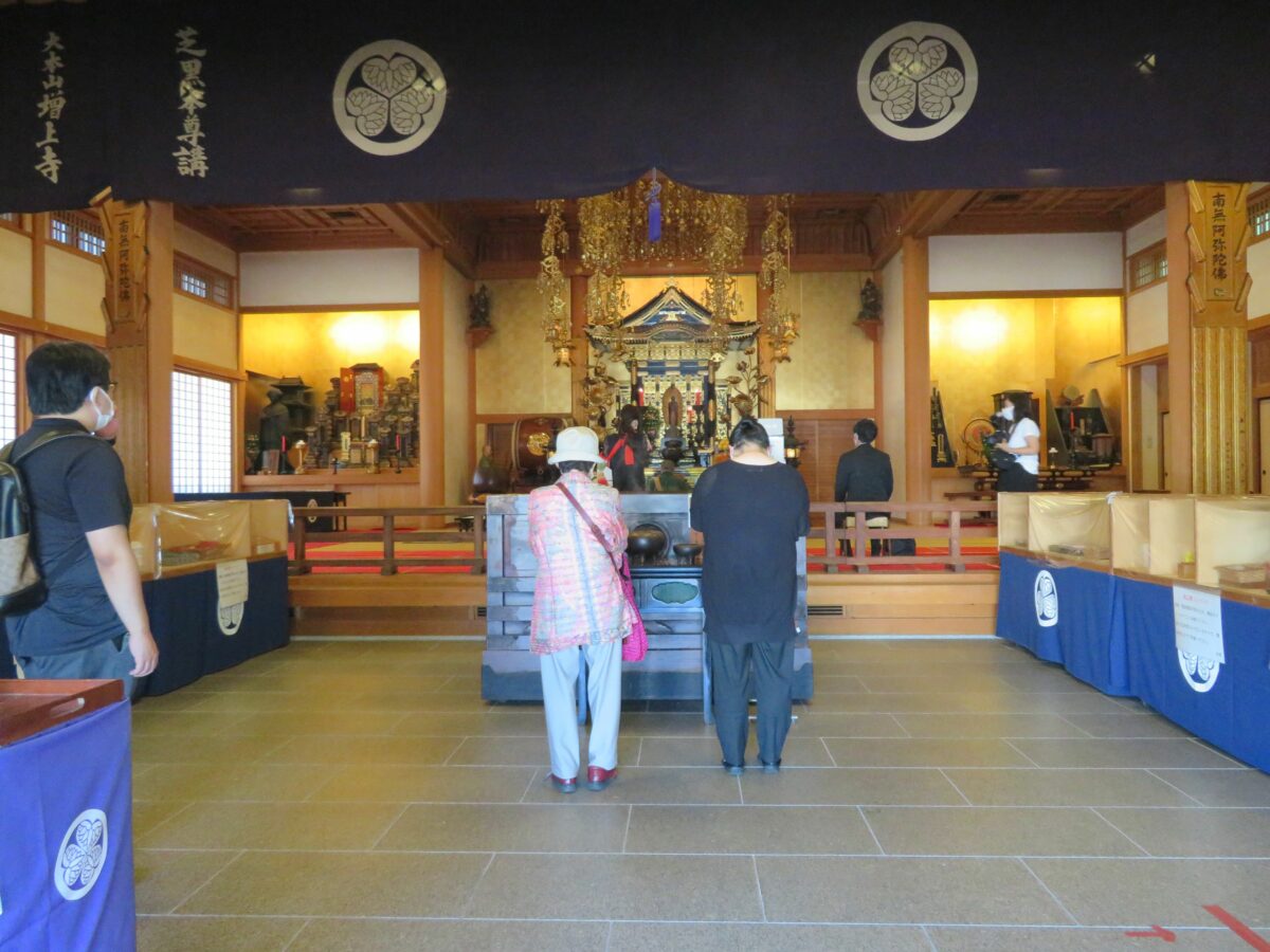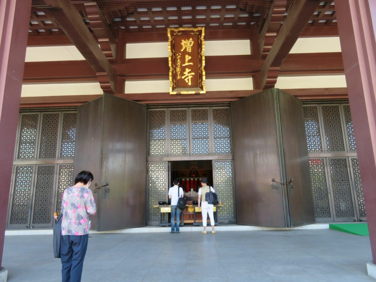 三門を潜って入る増上寺の境内には、厳粛なムードが漲ります。正面には東京タワーを背景として、大殿が威容を漲らせています。2階に本堂が設けられ、地下に宝物展示室が設けられています。
