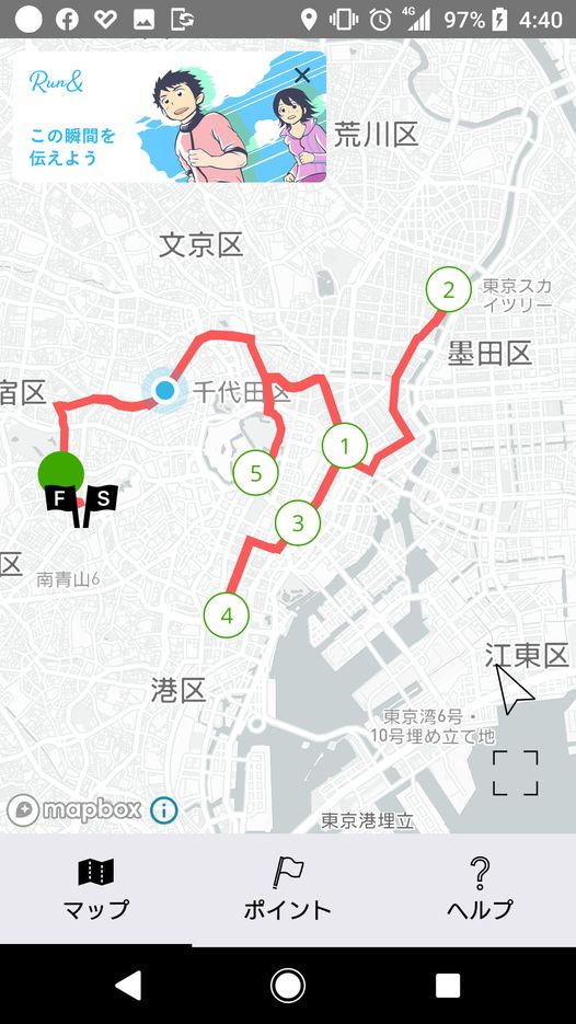 ①の日本橋までの間にチェックポイントが何もなく、信号や横断歩道で時間をロスしながらひたすら長い道のりを突き進みました。途中、⑤の皇居の方を通過して①まで進むのか良く分からず、他の参加者について行きましたが、①に直接行けばよかったようで、他の参加者の間違いにつられてロスしたのが痛かったです。
