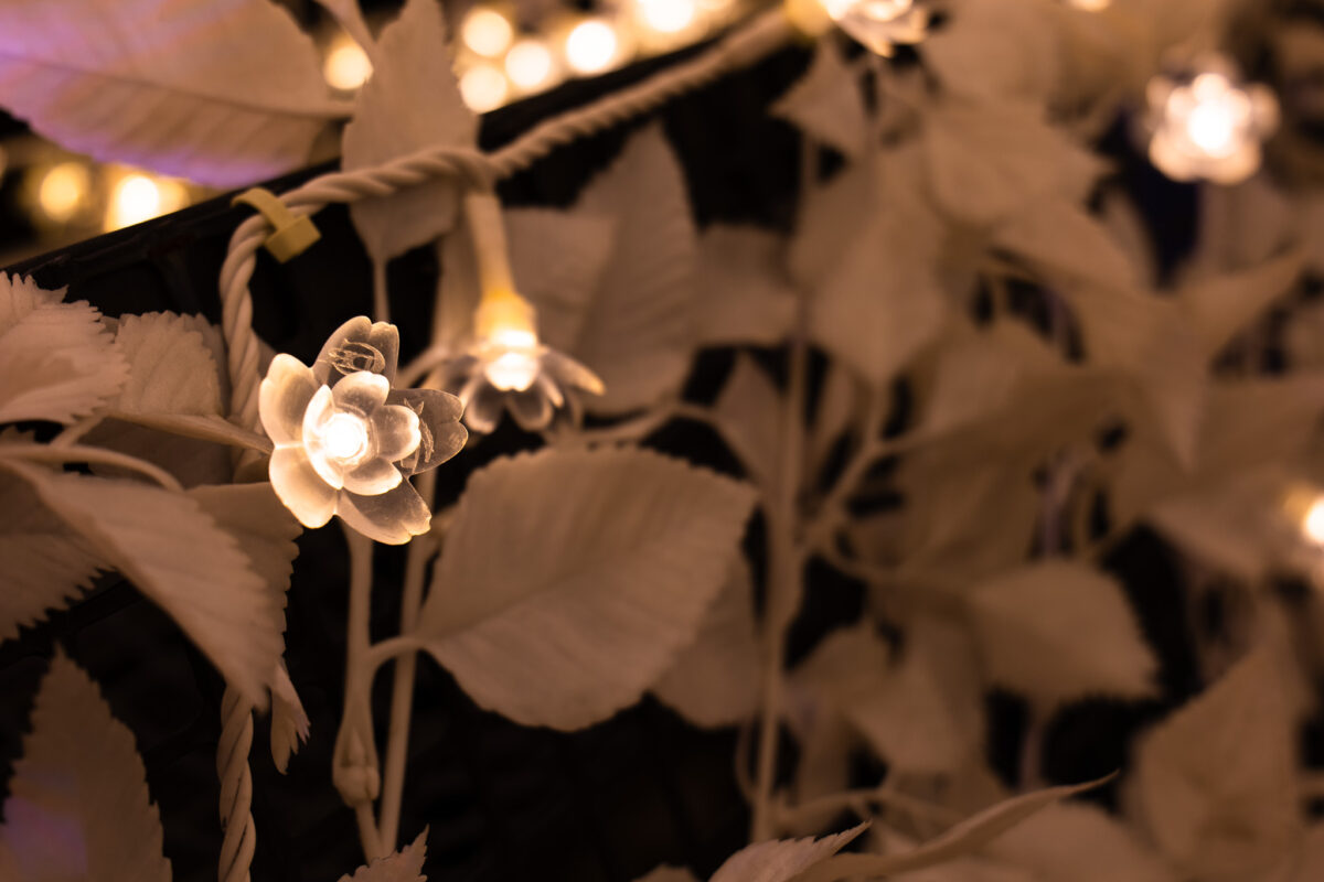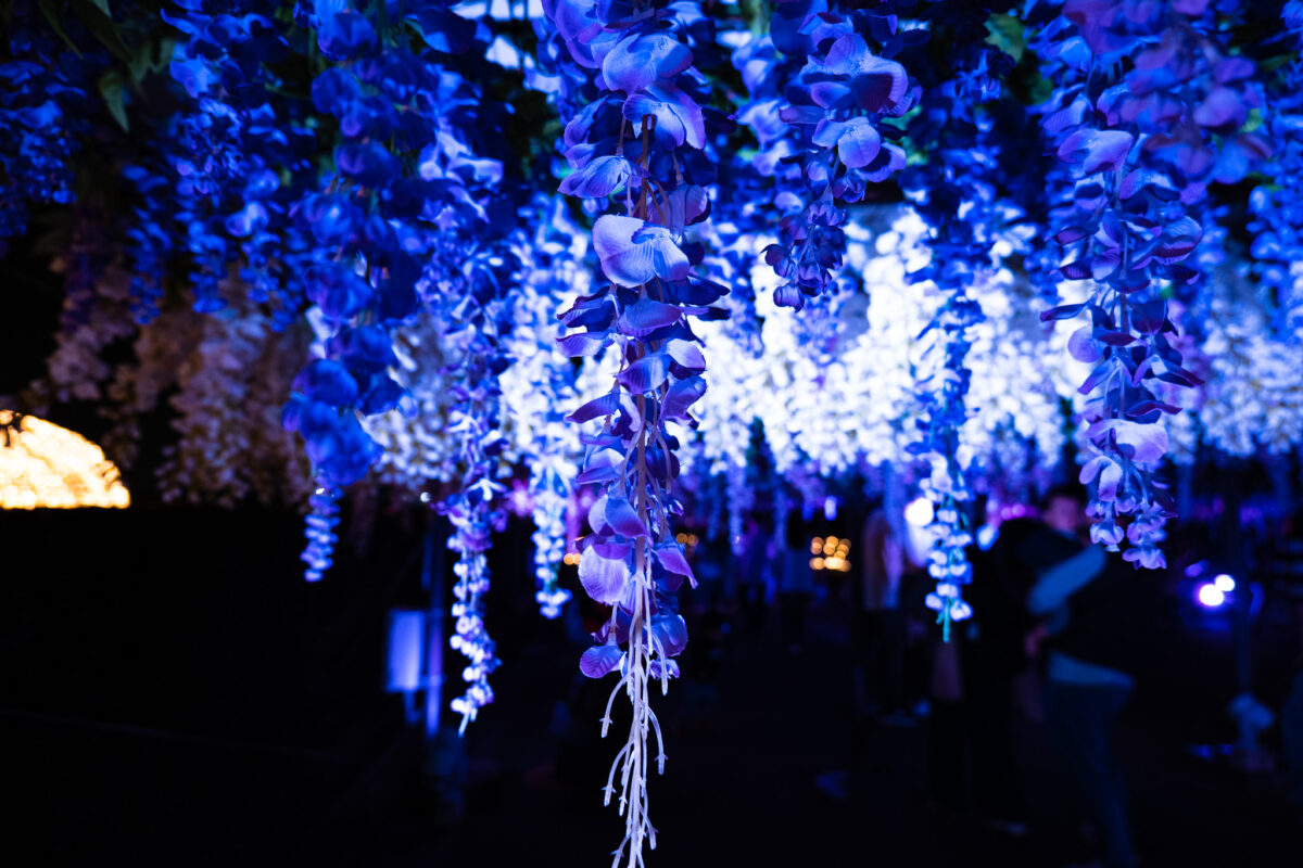 数え切れないほどのアートフラワーが垂れ咲く藤棚。ライトアップされた無数の花々が揺れ動く姿は、夢や幻を見ているような独特の風情を感じます。フォトスポットとしても人気があり、カメラを引いたり寄ったり工夫をしながら写真撮影している方も多くいらっしゃいましたよ。もし、オートフォーカスが中々定まらないときは、マニュアルに切り替えて撮ってみましょう。
