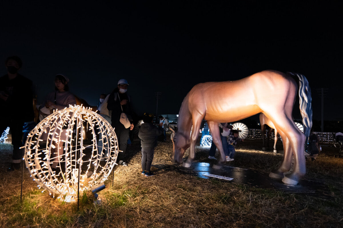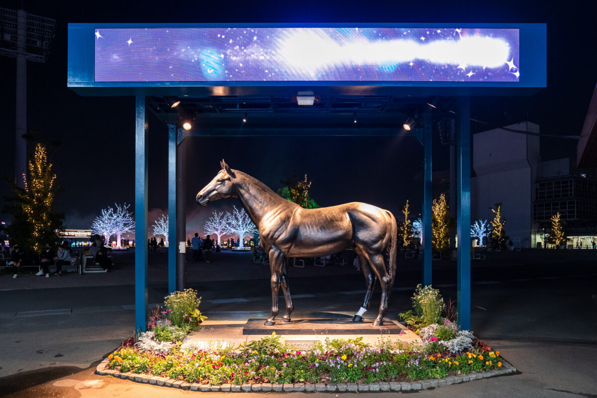 イルミネーションだけでなく、競馬場ならではの楽しみ方もあります。こちらは常設となりますが、かの有名なハイセイコー像。競馬に詳しくない筆者も、名前は聞いたことのある名馬中の名馬です。ハイセイコー像もフォトスポットとなっており、一緒に写真を撮っている来場者も絶え間なくいらっしゃいました。
