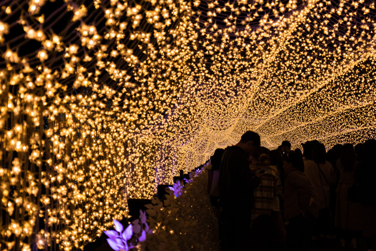 「TWINKLE TUNNEL」を抜けると、日本の情緒あふれる光の世界が広がります。自然の美しさをイルミネーションで表現した、どこか懐かしい和の景色は感動間違いなし!