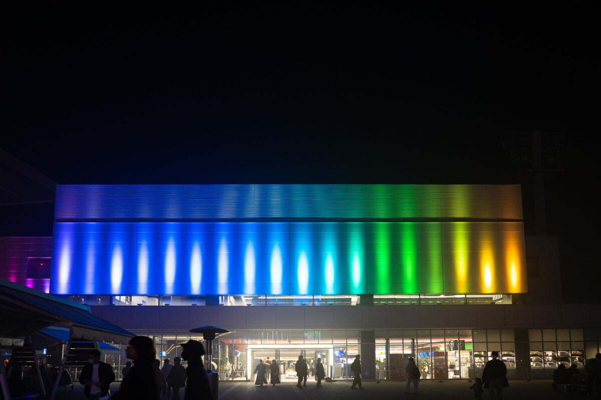 虹色に輝く大きな階段。どこから見てもきれいな彩りとなっているため、子ども達は大はしゃぎ。カップルたちは様々な場所で記念撮影していました。