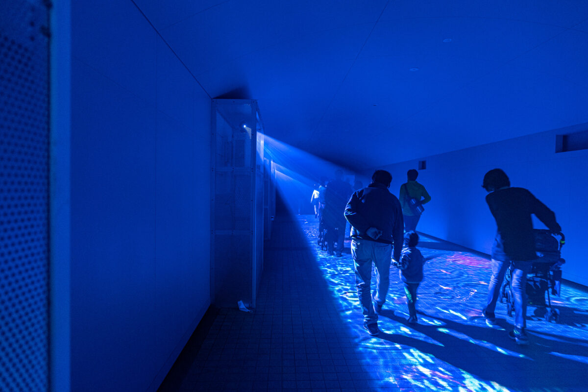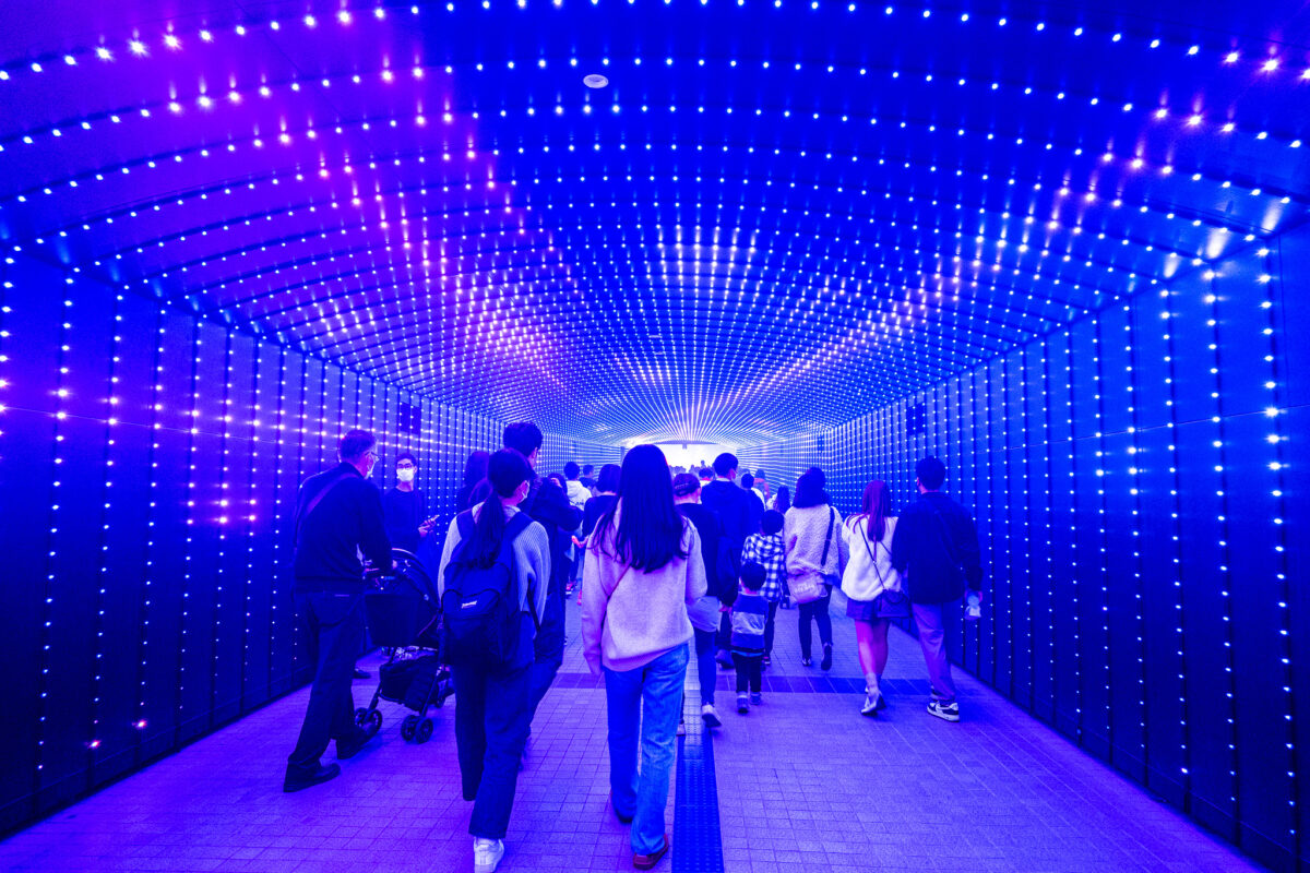 「L-WING」側(馬場を正面に左手)にある連絡通路(トンネル)。「和のきらめきエリア」に向かうにはこちらの連絡通路を利用します。もちろん、ただの連絡通路でなく、光による演出やプロジェクションマッピングなどを楽しめるようになっています。なお、一方通行となっているため、反対側(放牧場側)の通路からは、「和のきらめきエリア」に入れないのでご注意ください。