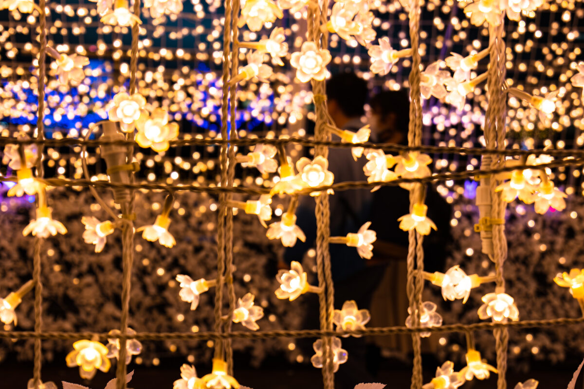 優しく彩る光のトンネル。よくみると、1つ1つが桜の花の形をしていますね。温かみのある光の中を歩いていると、日々の疲れがふわっと軽くなってきました。皆様も心安まる空間を満喫しませんか。