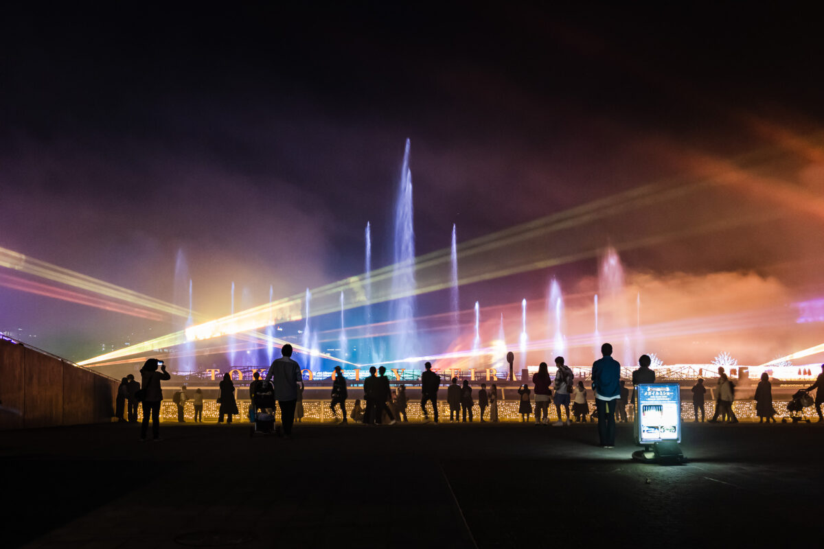 「東京メガイルミ」のメインイベントともいえる、噴水とオーロラのきらめきを演出した、1セット約15分間の光のショー(1時間に3セット20分置きに上演)。光彩と水柱が音楽に合わて元気いっぱいに舞い踊る「虹色の輝く光の大噴水」から始まり、壮大な大井競馬場の夜空を包み込むように神秘的な彩りで光る「オーロラの森」、オーロラの森にたたずむ大樹をムービングライトで演出する「光と遊ぶ大樹」の順に楽しむことができます。