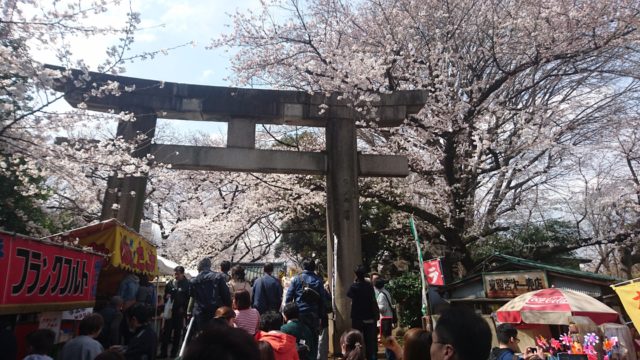 鳥居の先は森を抜ける参道に活気ある露店たち、さくらの品種もさまざまで旧寛永寺五重塔ほか歴史ある建造物に大変映えます。