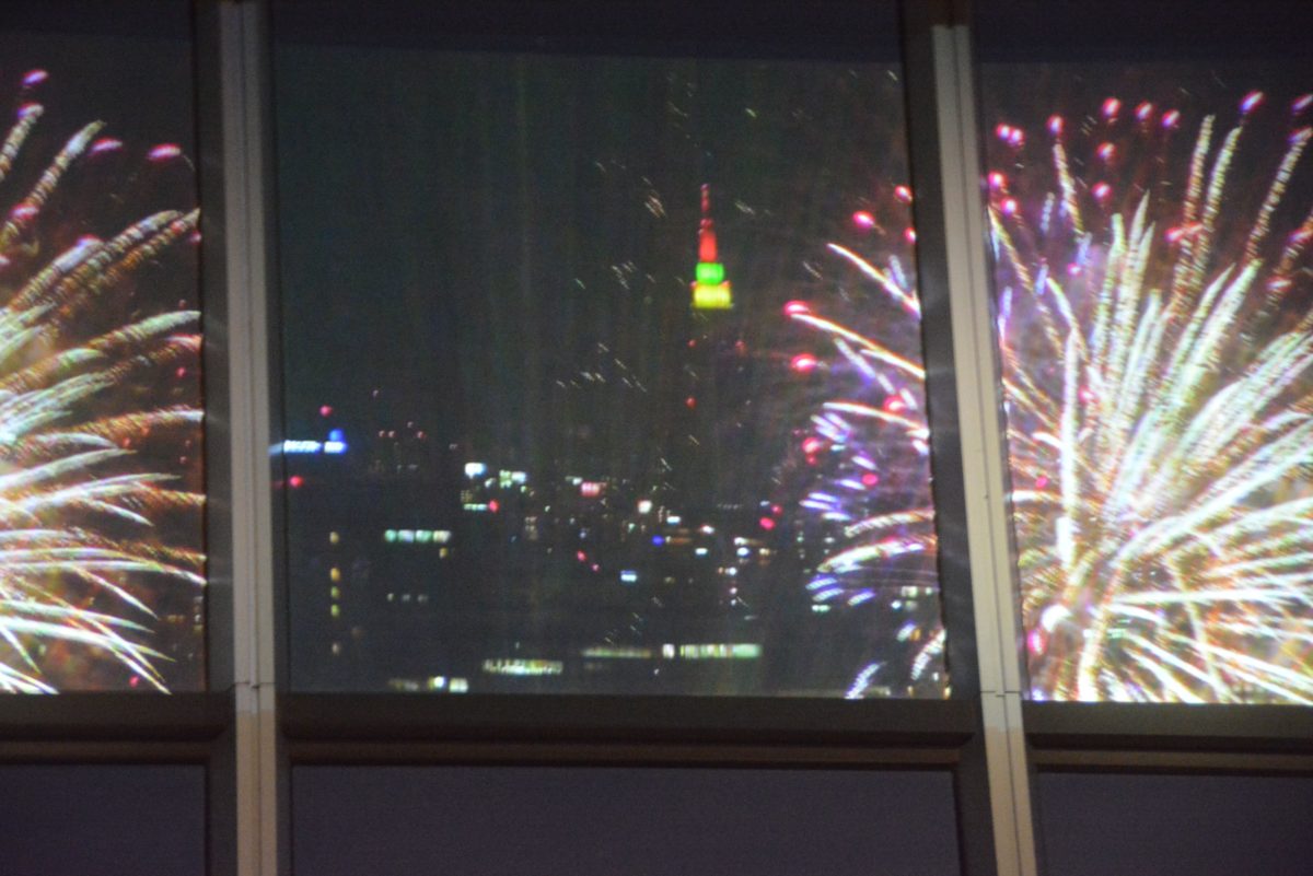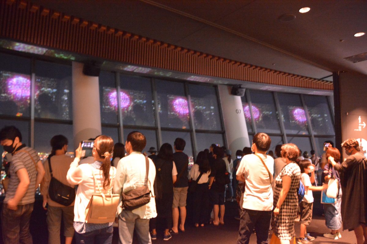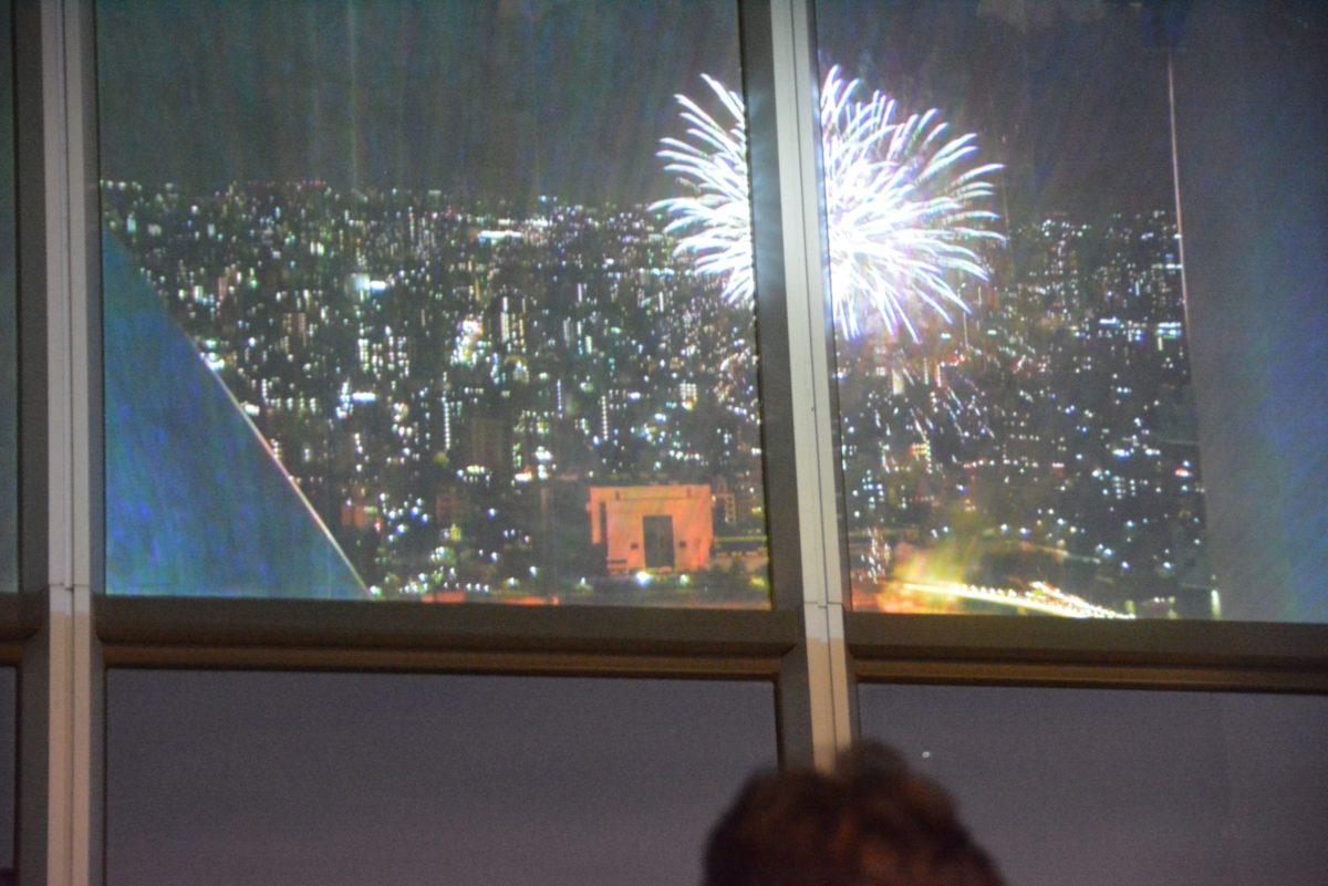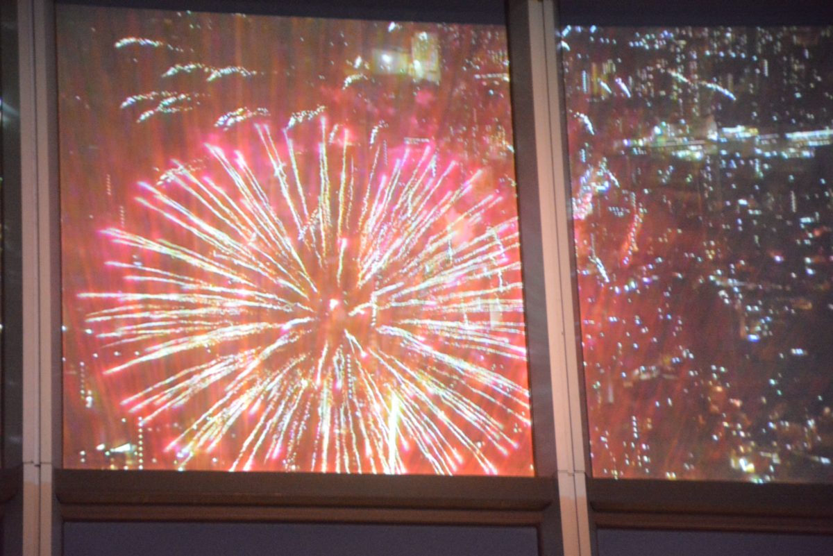 フロア350の天望デッキの巨大スクリーンに映し出される隅田川花火大会の映像