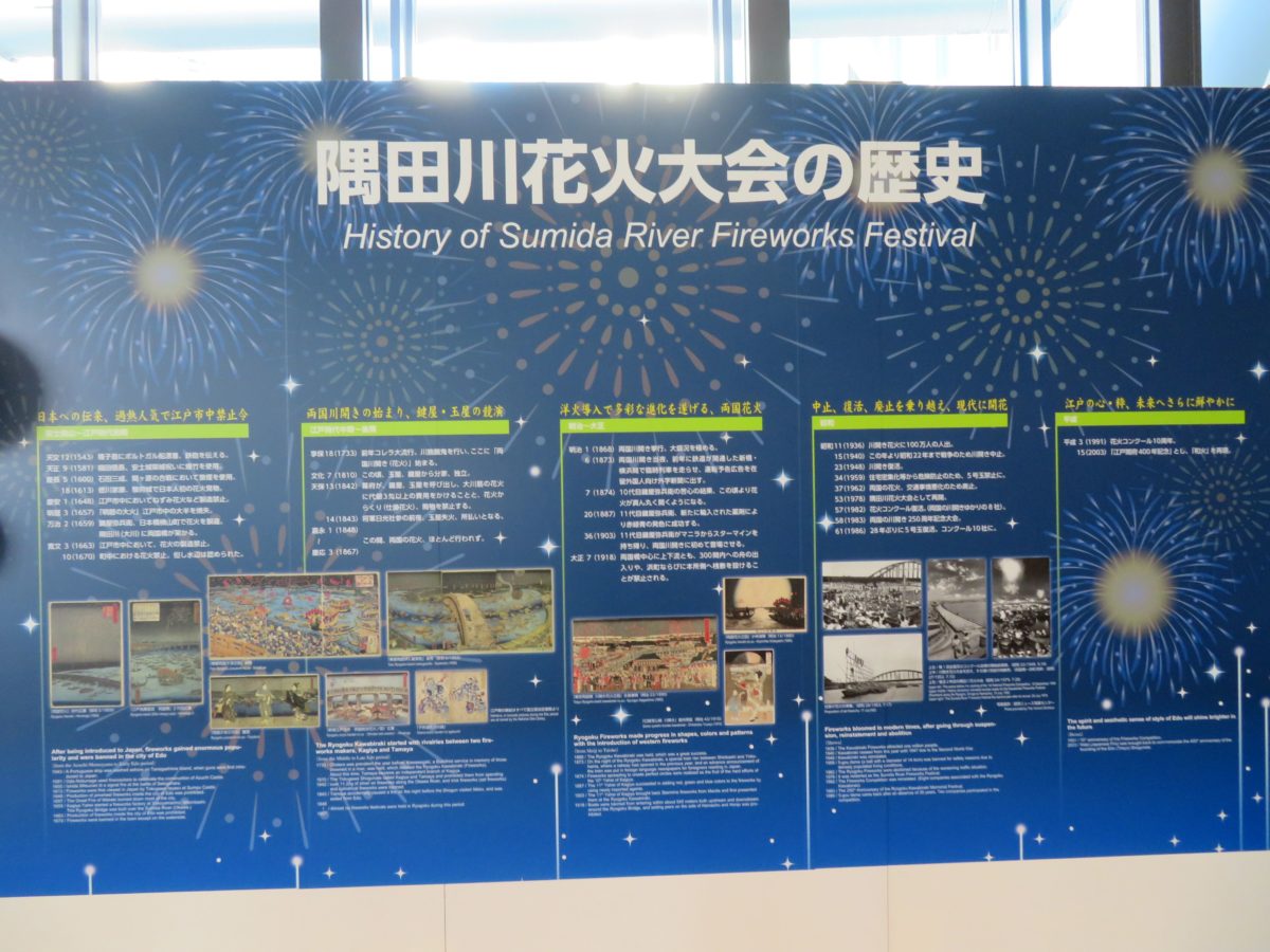 東京スカイツリーの4階ホールに展示される隅田川花火大会の歴史