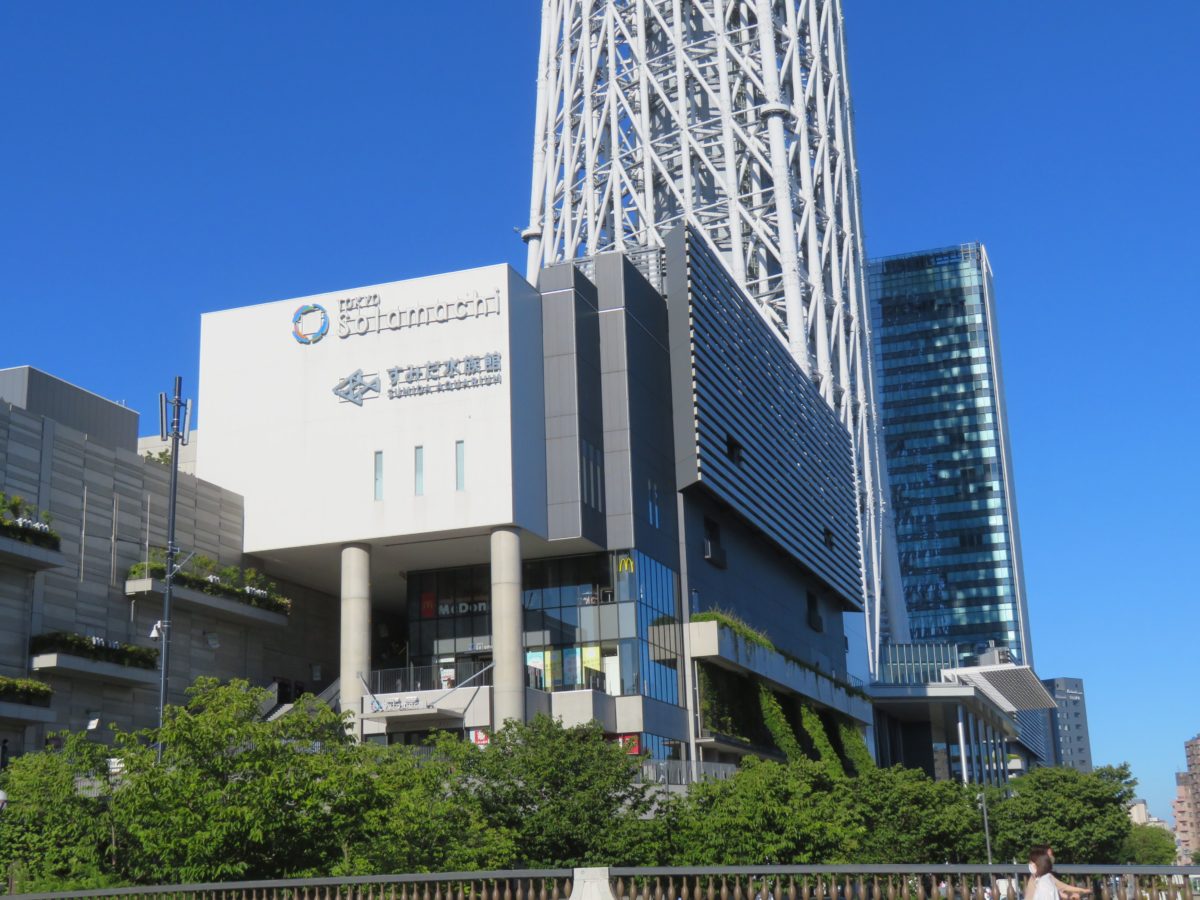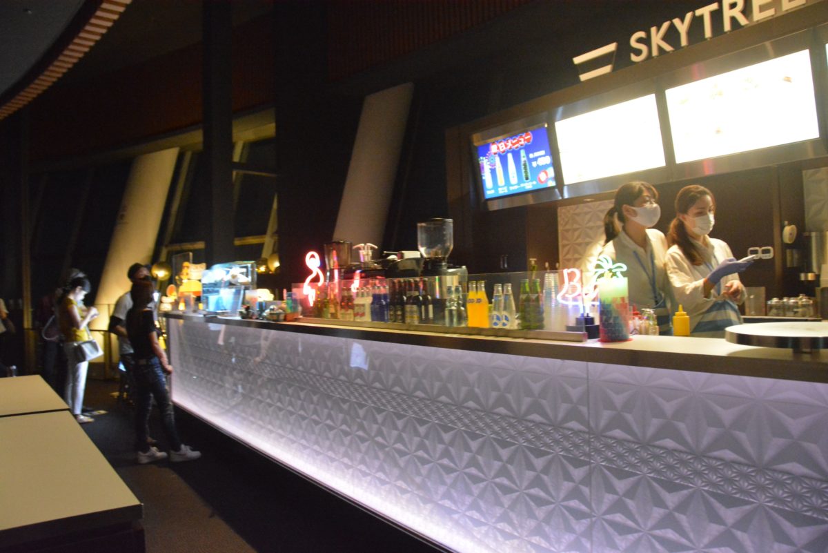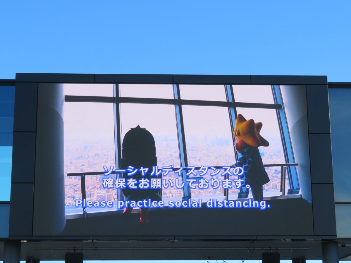 東京スカイツリーは都内でも屈指の観光スポットであるため随所で、新型コロナウイルス感染拡大防止のための呼びかけが行われています。スカイツリーの玄関の役割を担うスカイアリーナの大型ディスプレイには、感染防止のために注意すべきことが繰り返し映し出され、チケット売場には体温測定のためのサーモグラフや消毒スプレーが設置されています。