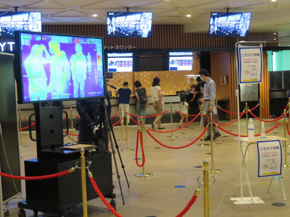 サーモグラフや消毒スプレーが設置されるチケット売場
