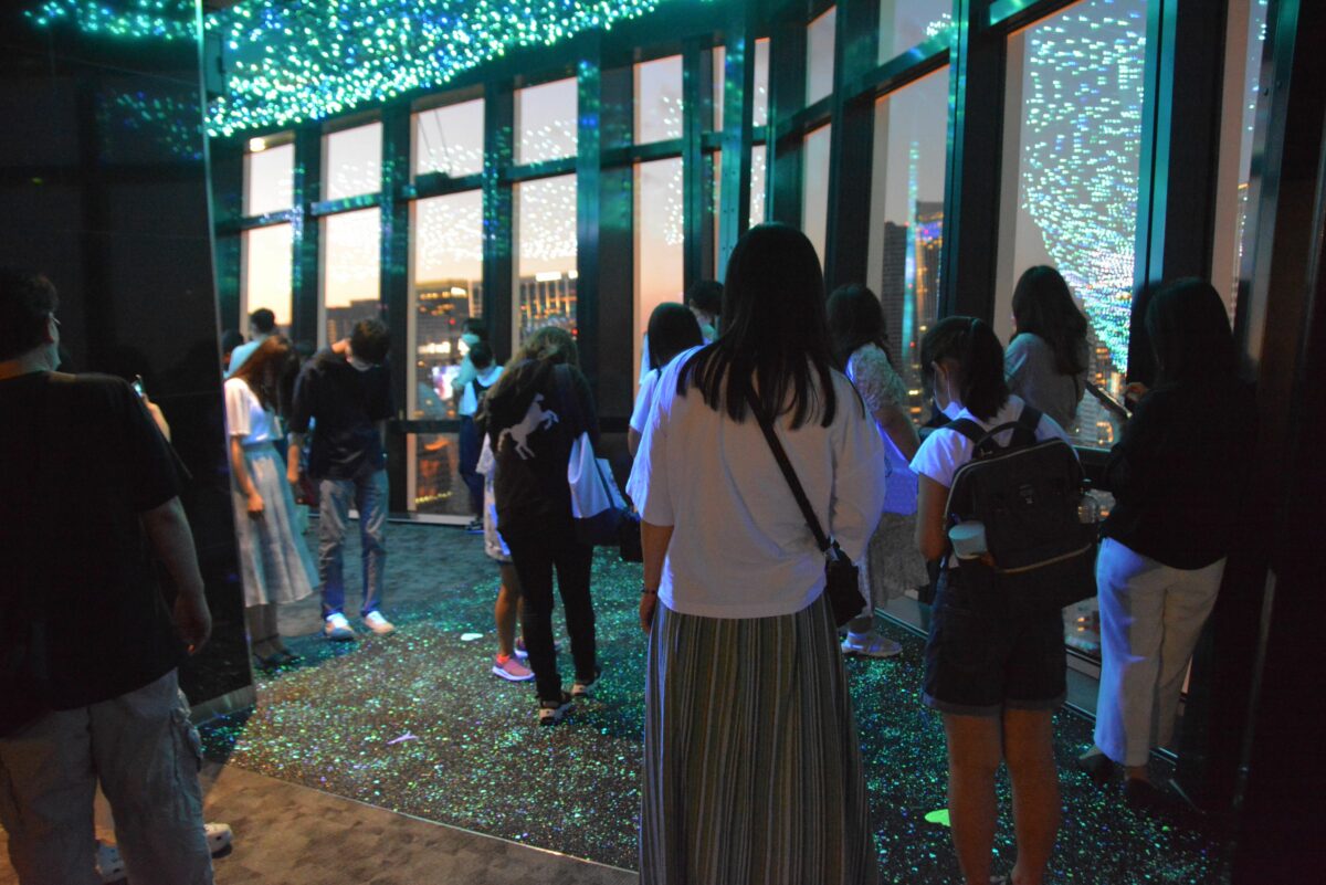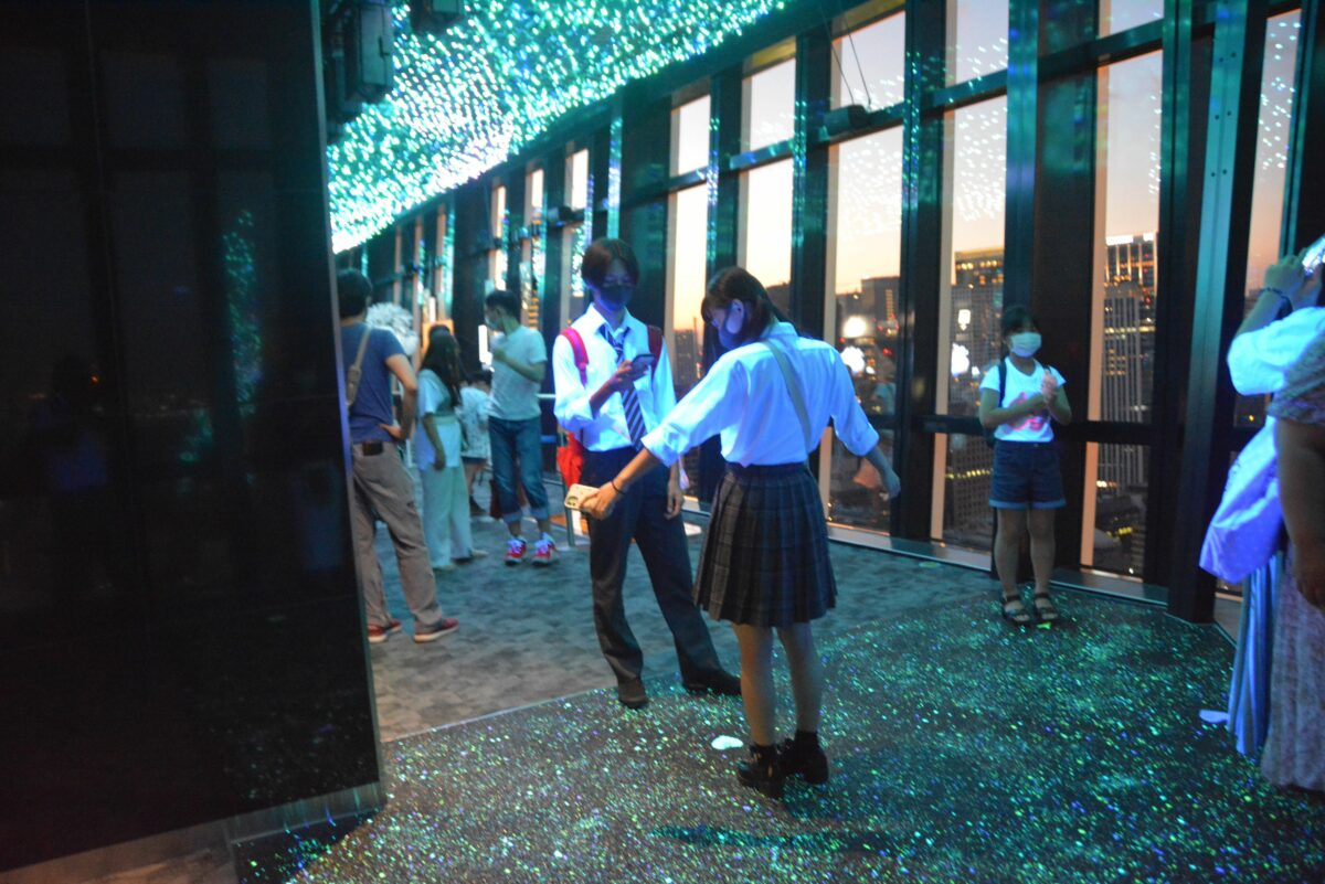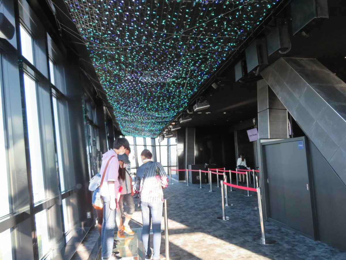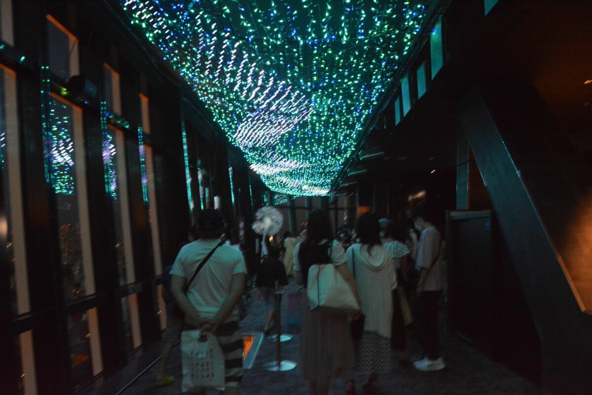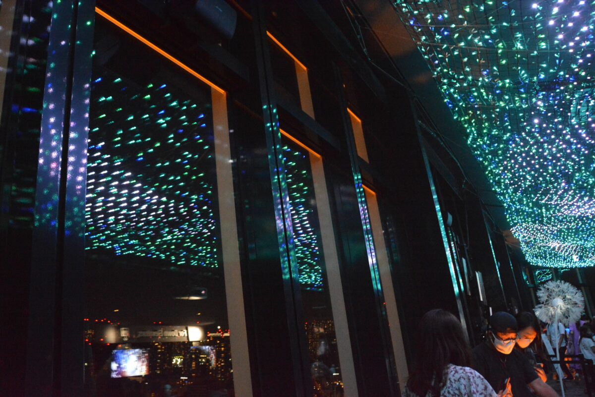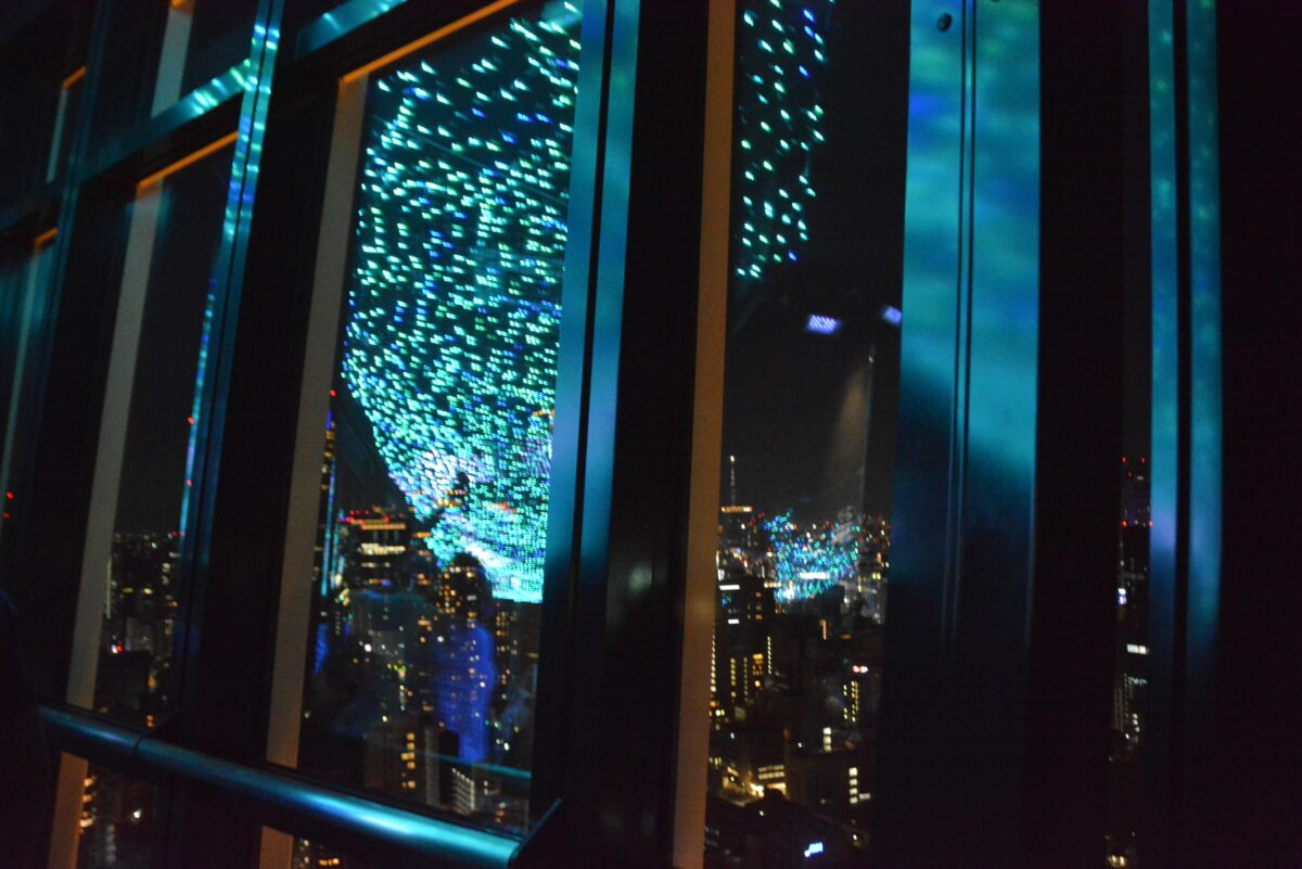 夜間に展望台のガラス窓に映り込むイルミネーションの光