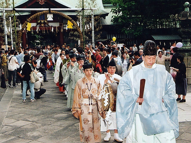 一番の見所は、総勢500人もの王朝装束をまとった行列が皇居、東京駅周辺、銀座などかつての江戸城内23kmの距離を9時間かけて巡行する「神幸祭」。また、日本橋~京橋地区を威勢の良い17基もの神輿が練り歩く「下町連合渡御」は、江戸の下町の心意気を感じられる催しです。