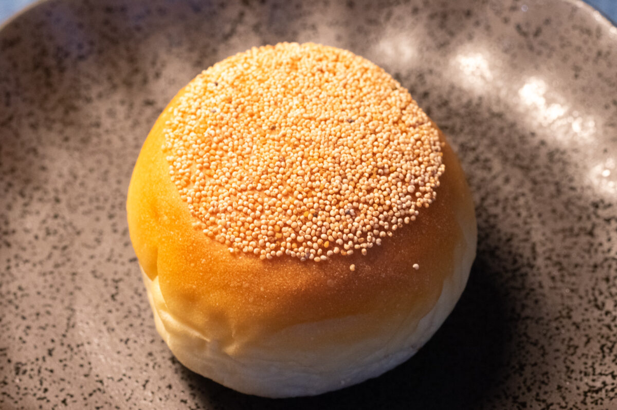「けしの実」がトッピングされた、明治7年(1874年)販売の「あんパン」。外見からすると「つぶ餡」かと思いましたが……。