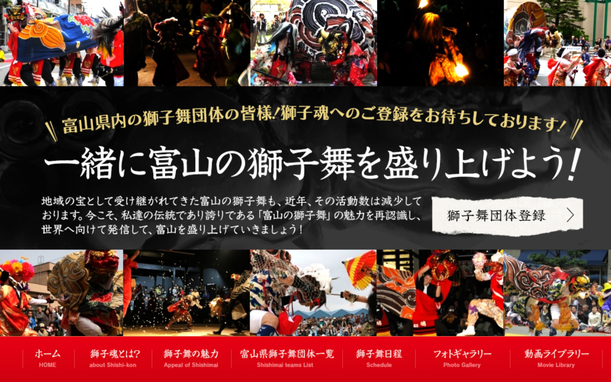獅子魂というサイトでは、富山県の獅子舞に関しての情報が集約&公開されている。市町村ごとにどのような獅子舞がいくつあるのかが、一覧でわかるようになっているのだ。こちらのサイトを運営されているのが獅子魂プロジェクト実行委員会という団体で、獅子舞団体の登録や応援するサポーターの募集も行なっているそうだ。富山県の有志が集い獅子舞を盛り上げていこうという熱量を感じる。獅子魂の詳細はこちらのホームページからご覧いただきたい。(以下の写真はホームページの様子)