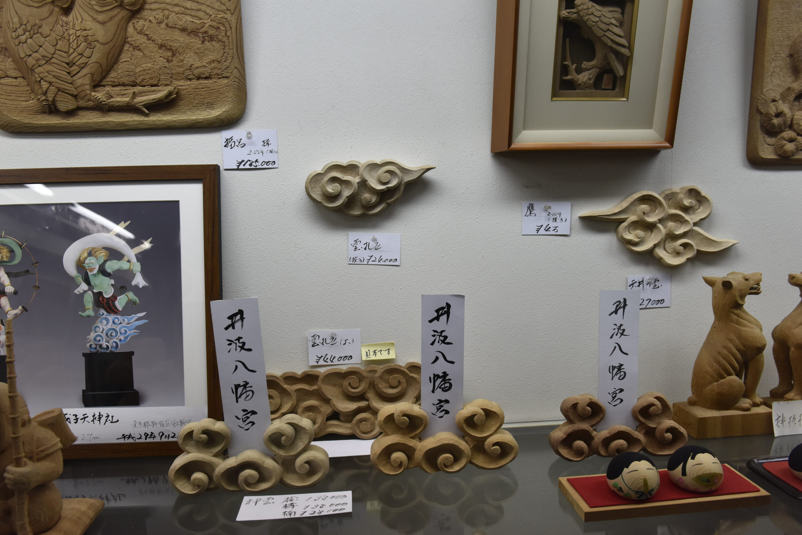 「最近流行っている彫刻作品はどれですか?」と尋ねてみた。返ってきた答えは、この雲形の彫刻とのこと。井波の木彫りといえば欄間が有名だが、1つ注文するだけでも数百万円する作品を、大人買いできるような時代でもない。手軽に手を出せる価格帯のものといえば、この2万円台の雲形の彫刻らしい。