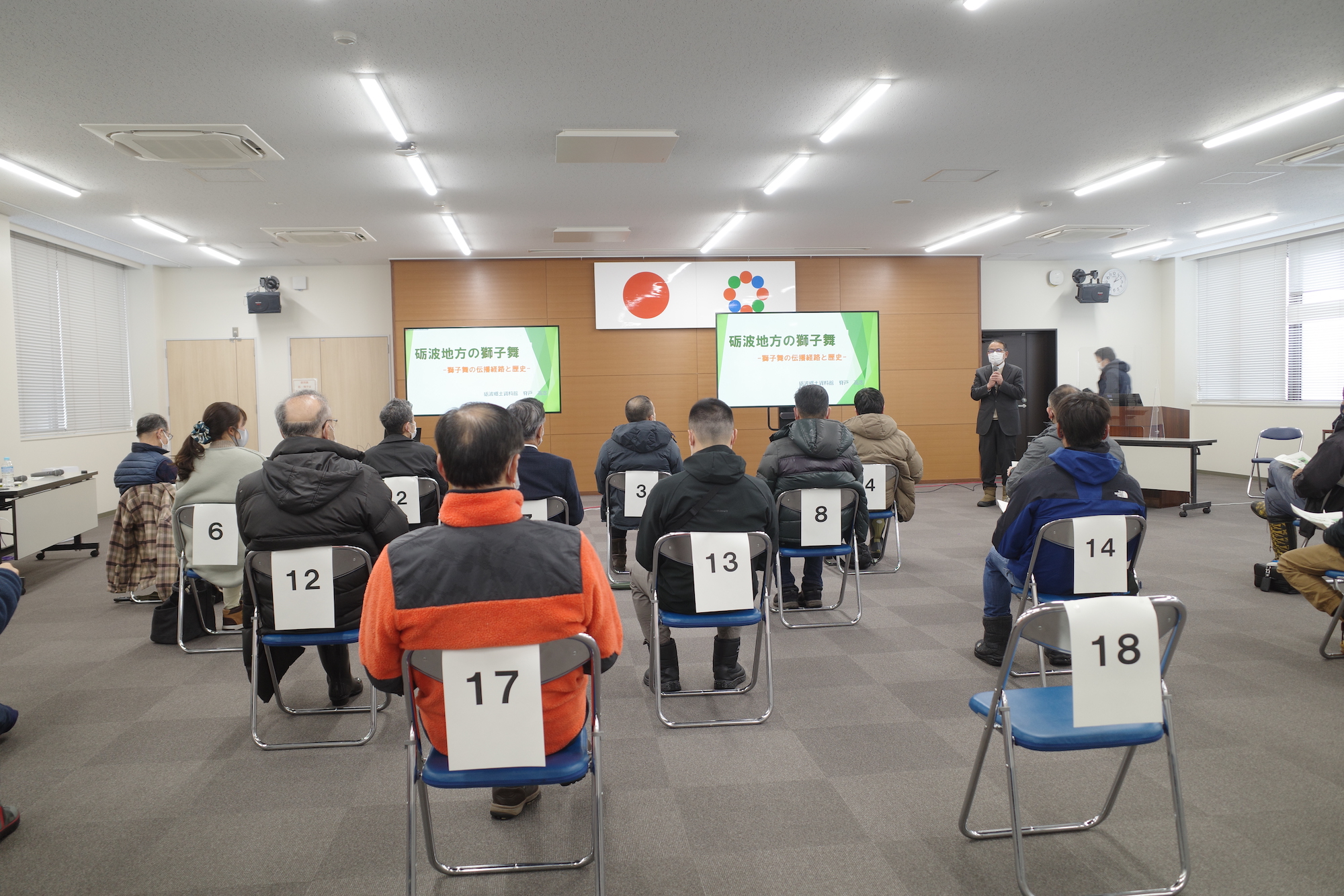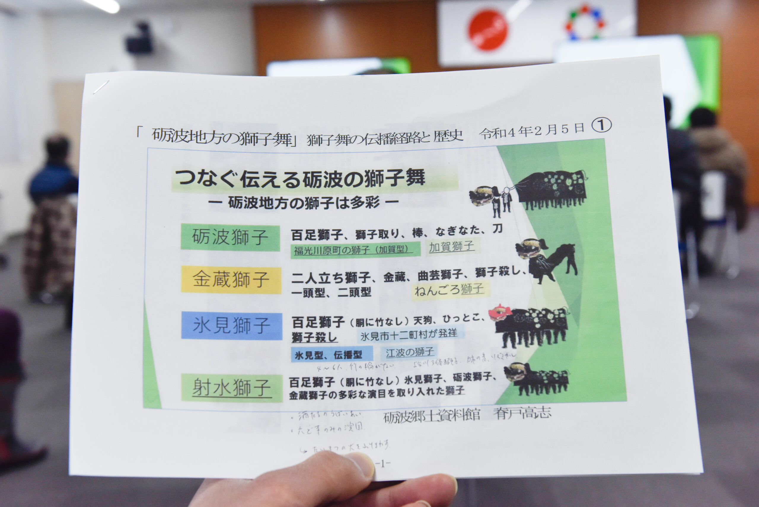 2月5日の14時から15時半の日程で、南砺市役所にて「獅子舞講演会」が行われた。この講演会は行政が主催しており、富山県西部地域(高岡市、射水市、氷見市、砺波市、小矢部市、南砺市)を「呉西圏」として、歴史文化を連携して学ぶ機会を提供していこうという取り組みの1つである。