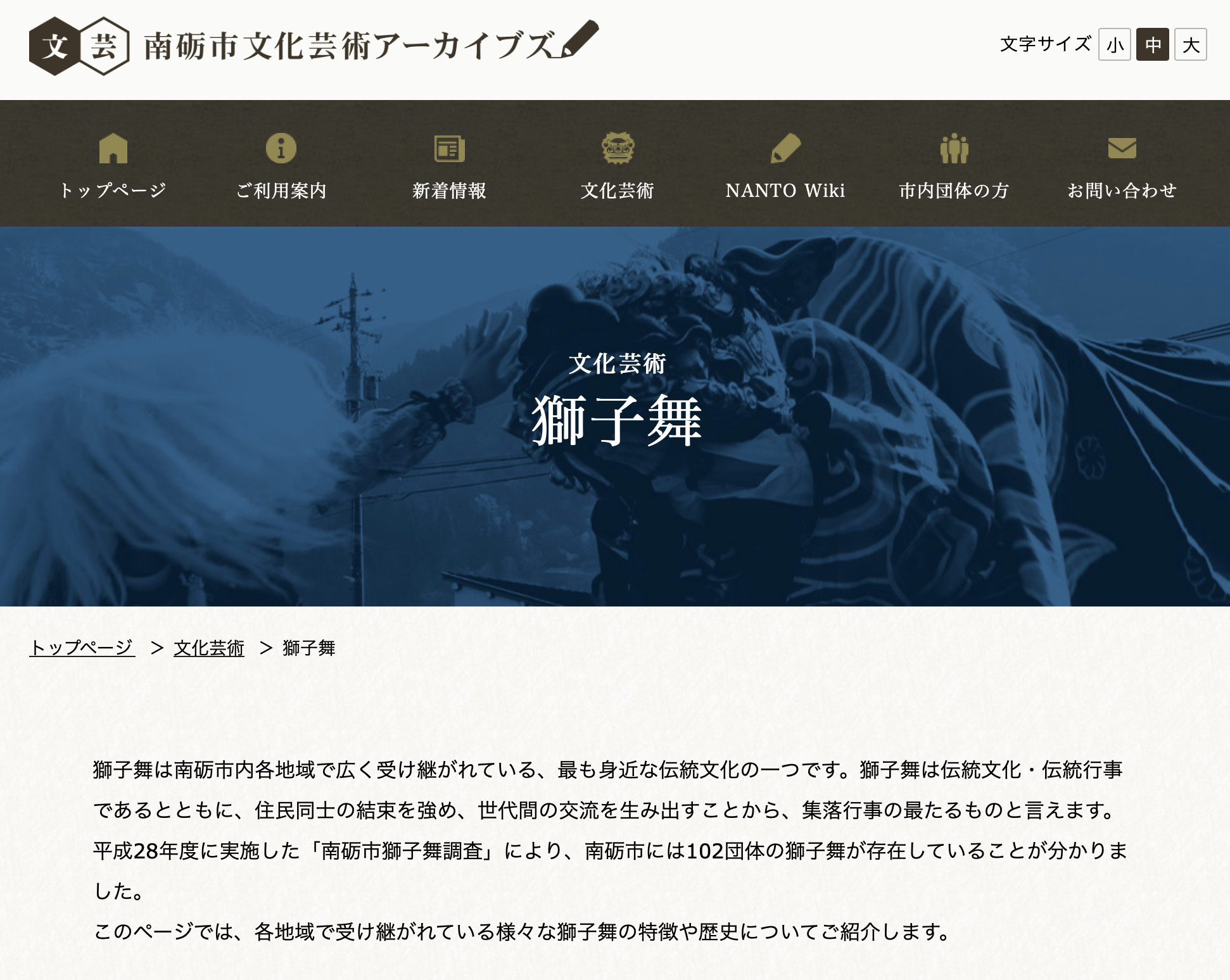 このサイトをご覧いただくと、各地域ごとに獅子舞が見られる日程や演目、歴史などを確認することができる。全体として質の高い情報が見やすくまとめられており、市民の文化・伝統芸能に対する理解の深さが感じられる。南砺市芸術アーカイブズの詳細はこちらのホームページからご覧いただきたい。(以下の写真はホームページの様子)