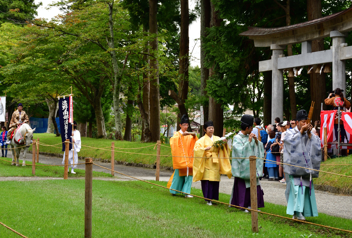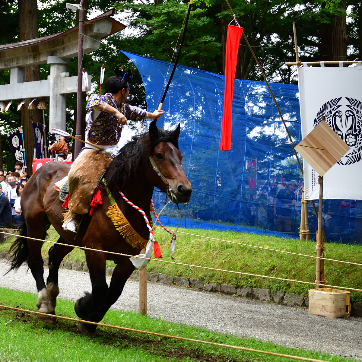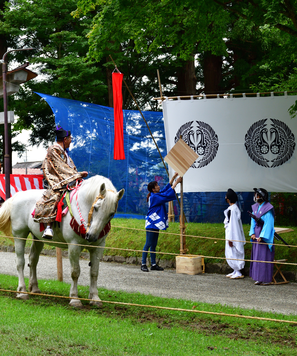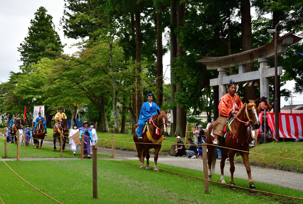 矢を射る「射手奉行」が走った後は、「介添奉行」と呼ばれる褒め役が「よう射たりや~」と馬に乗って叫びながら褒めたたえるのが南部流の流鏑馬です。介添奉行は矢を射ないとはいえ、そのぶん高速で走り抜けるので、手放しで乗るのはかなりの技術が必要ですね!