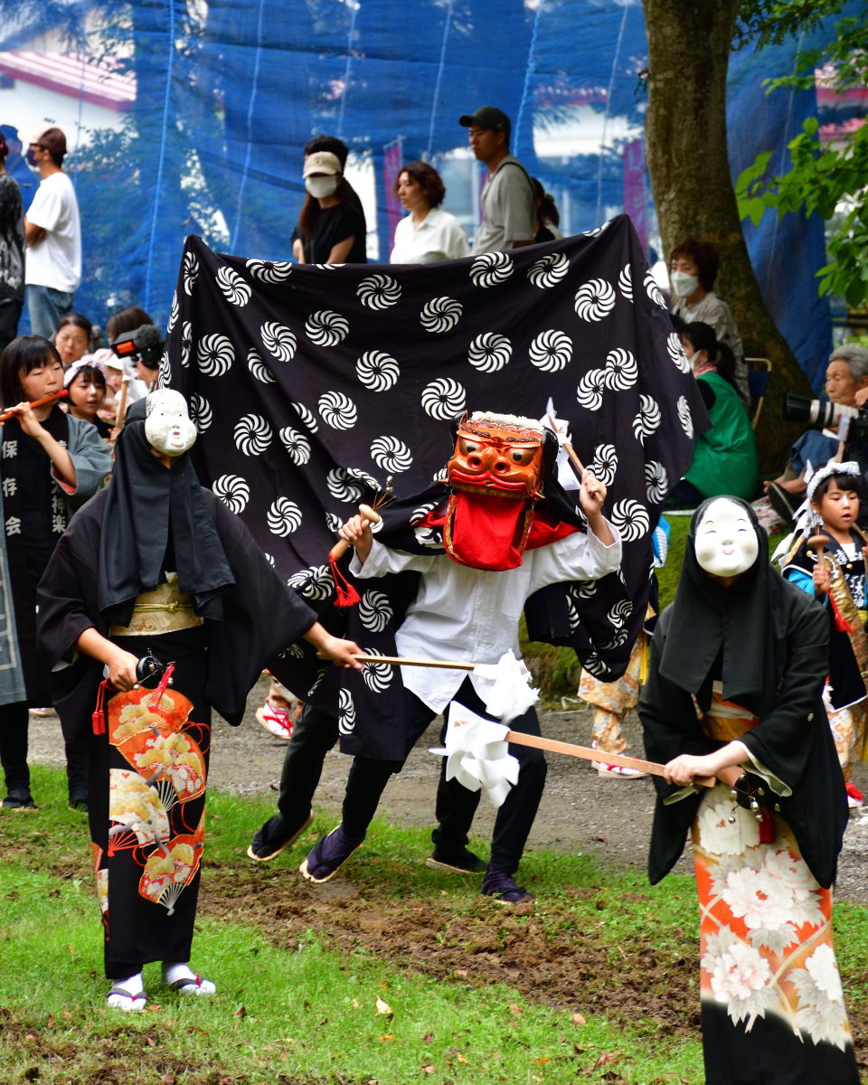 花巻・江刺地方では、踊り手自らが太鼓を鳴らす「太鼓踊り系」、遠野地方では、踊り手は幕を持ちながら踊る「幕踊り系」に分かれます。各団体により、「獅子・鹿子・しし」と、名称が変わります。