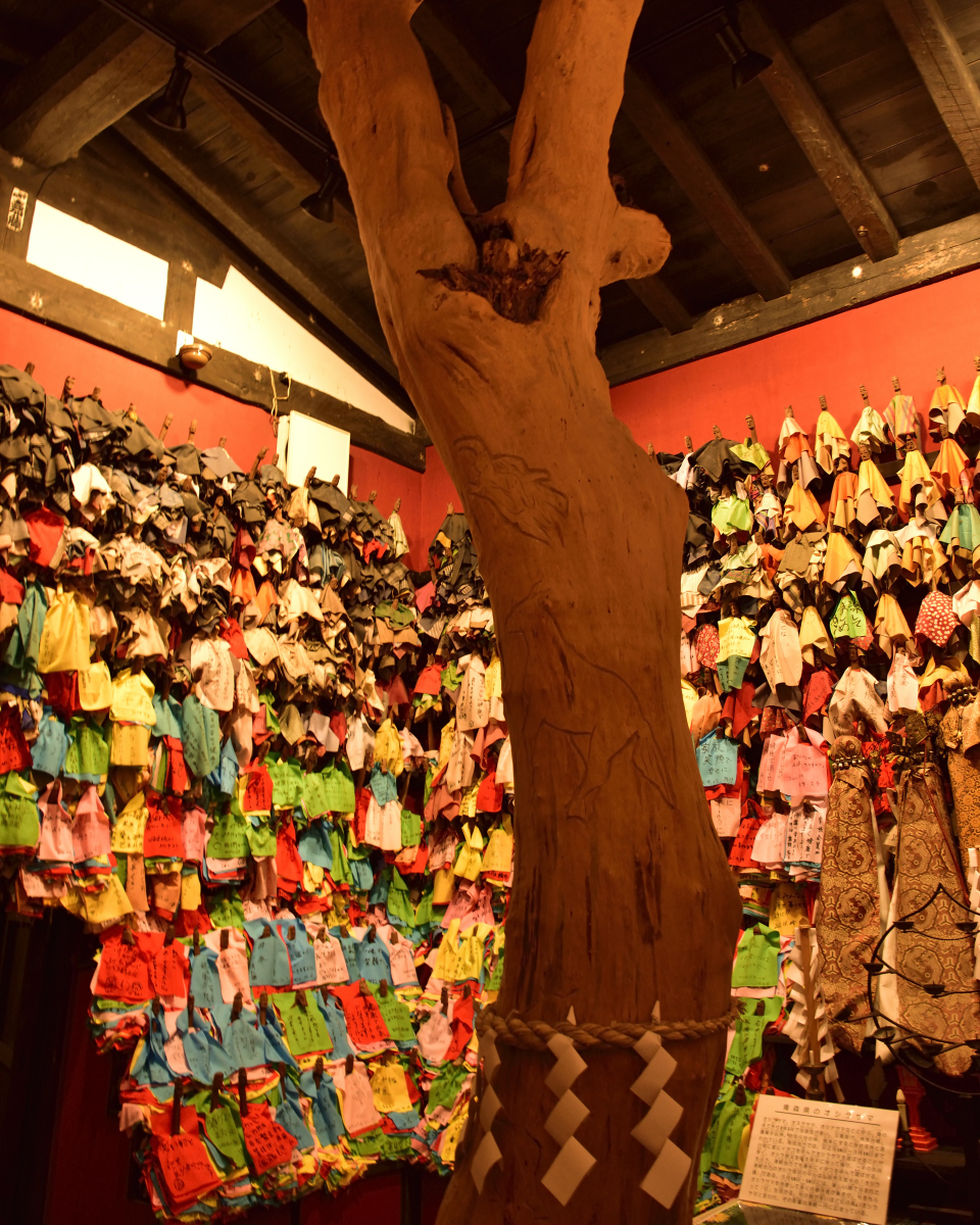 養蚕の神様であり、馬と娘の悲恋の昔話もある「オシラサマ」がカラフルに1000体安置されているオシラ堂があります。1日目パレードのエリア名になっている「おしら様」の現物はこちらでご覧になれます。おしら様は、桑の木で作った素朴な人形に、端切れを重ねて着せた姿をしています。