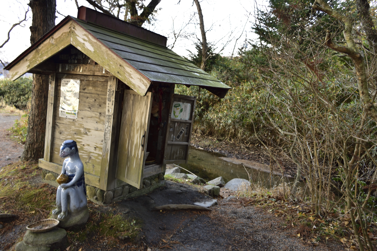 遠野市土淵町にある、カッパが現れた伝説が残る小川。小さな社があります。