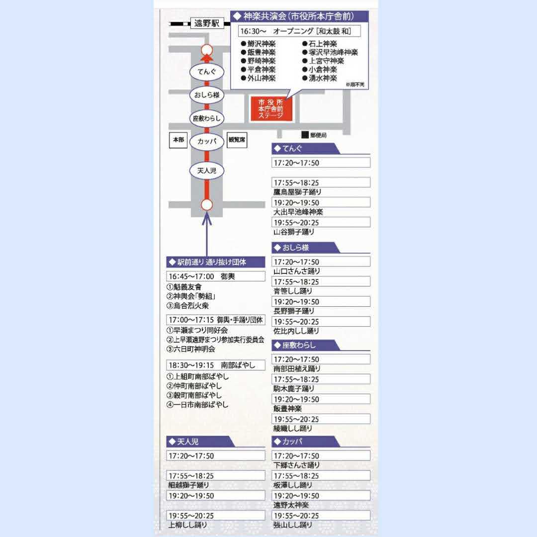 盛りだくさんのパレードでしたが、夜の部では、駅前通りが遠野にちなんだ名前を持つ5つのエリアに分けられ、各エリアで芸能が披露されます。
