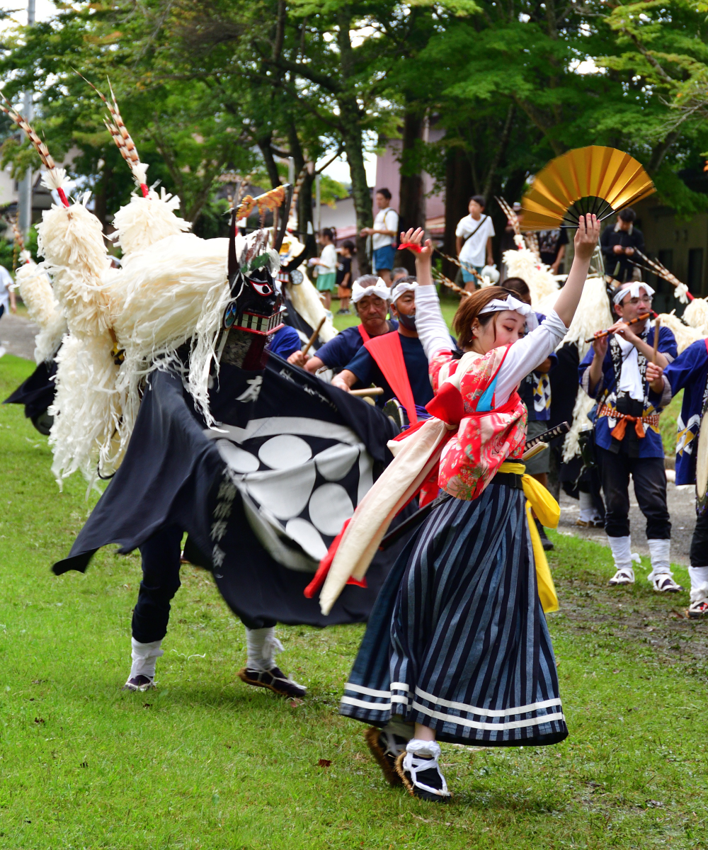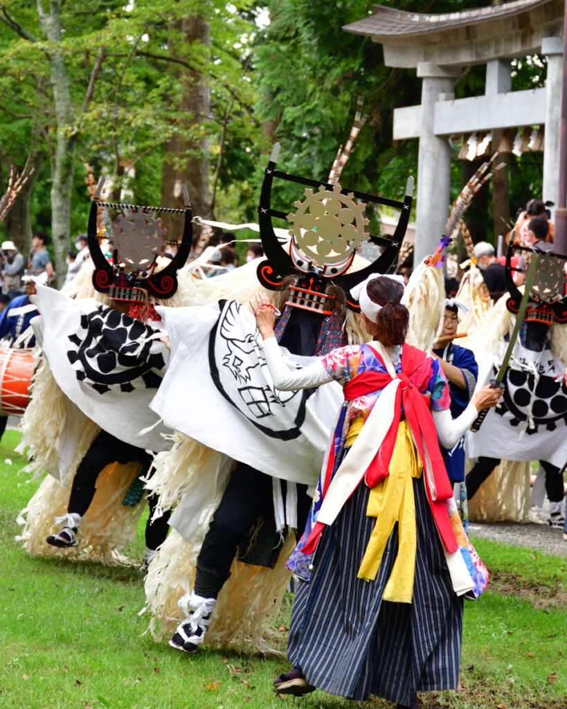 「綾織しし踊り」。綾織は「太刀振り」と呼ばれる女性の踊り手が独特。太刀振り同士での剣舞がある。
