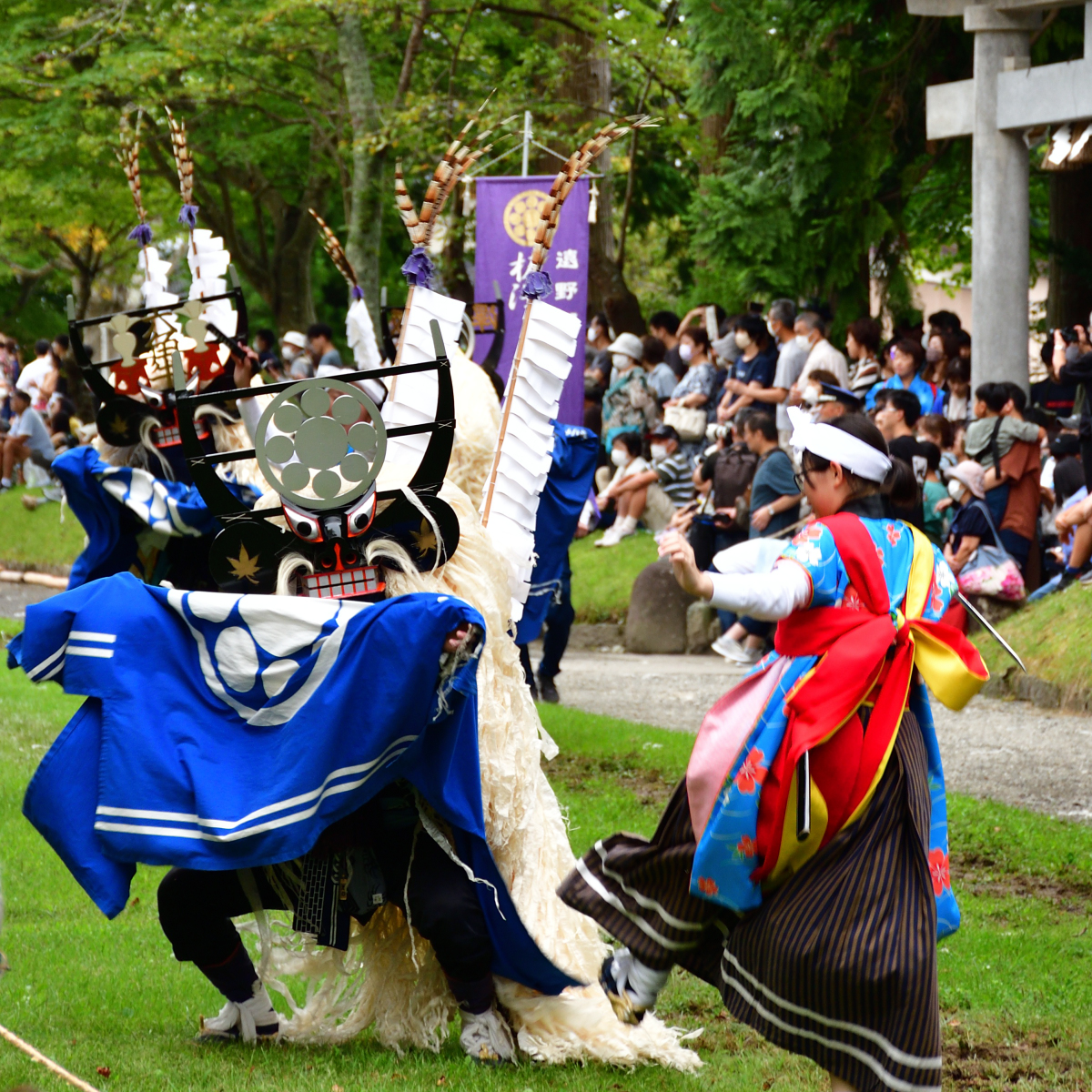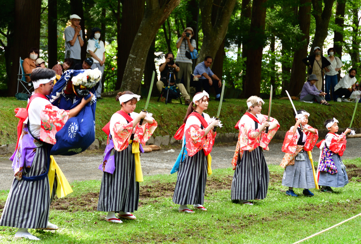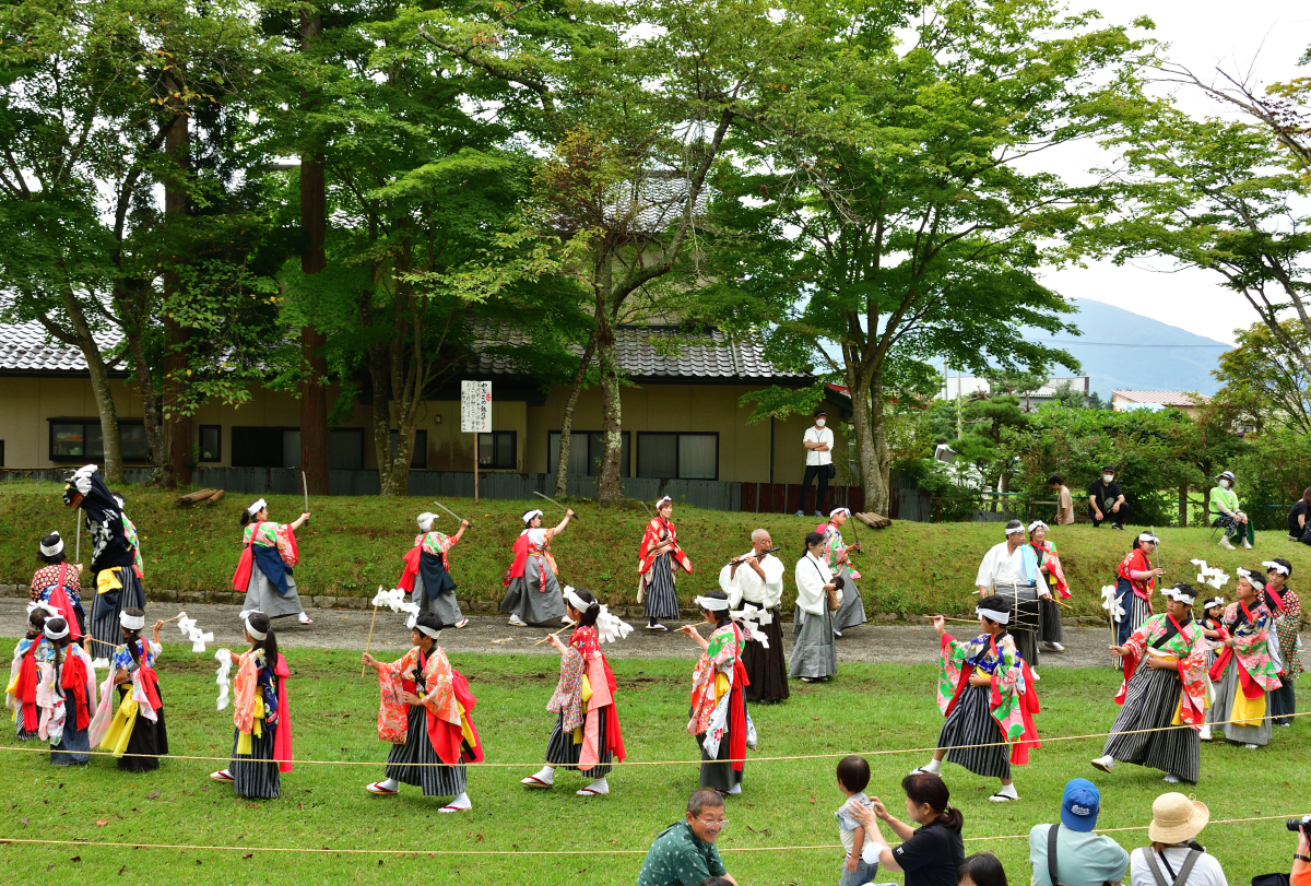 流鏑馬の終了後は、郷土芸能のパレードを馬場で行う「馬場めぐり」。