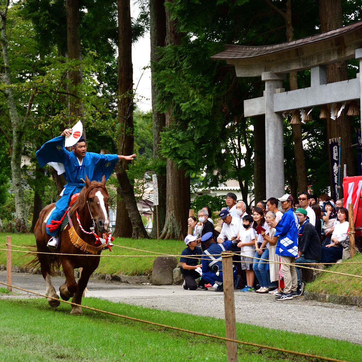 矢を射る「射手奉行」が走った後は、「介添奉行」と呼ばれる褒め役が「よう射たりや~」と馬に乗って叫びながら褒めたたえるのが南部流の流鏑馬です。介添奉行は矢を射ないとはいえ、そのぶん高速で走り抜けるので、手放しで乗るのはかなりの技術が必要ですね!
