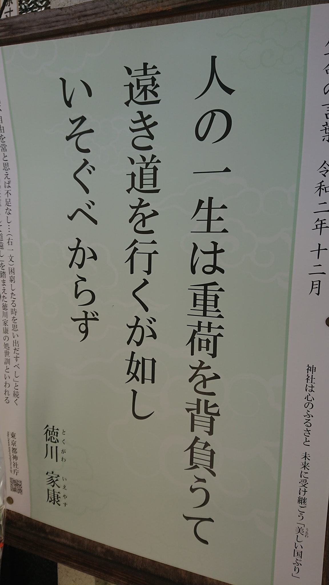 徳川家康を祀っていた松平神社が関東大震災で焼失し、鳥越神社に併合されたため、徳川家康のありがたい言葉が掲示されておりました。ちなみにライターは外出する時は殆ど手ブラです笑