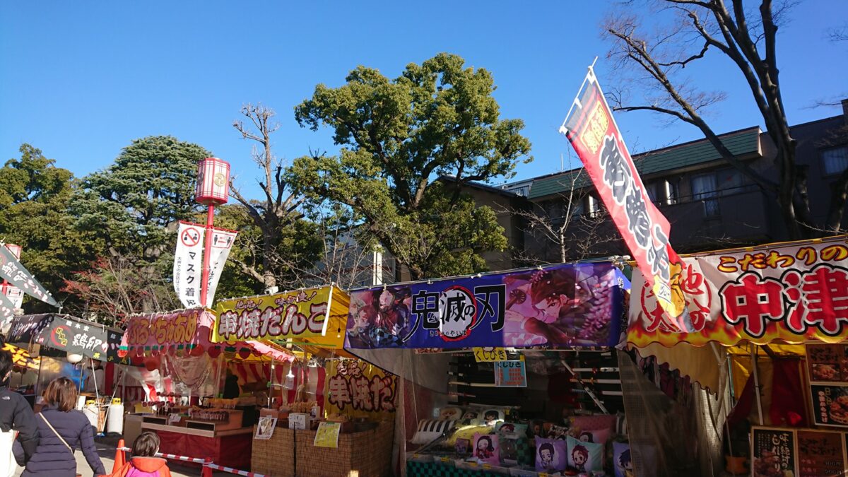 深川不動堂から富岡八幡宮の本殿に向かうまでの間も、概ね200m程あるのですが、その間にも屋台が充実しておりました。吉原遊郭編のアニメ化配信の決定した人気アニメ『鬼滅の刃』の屋台もありました。