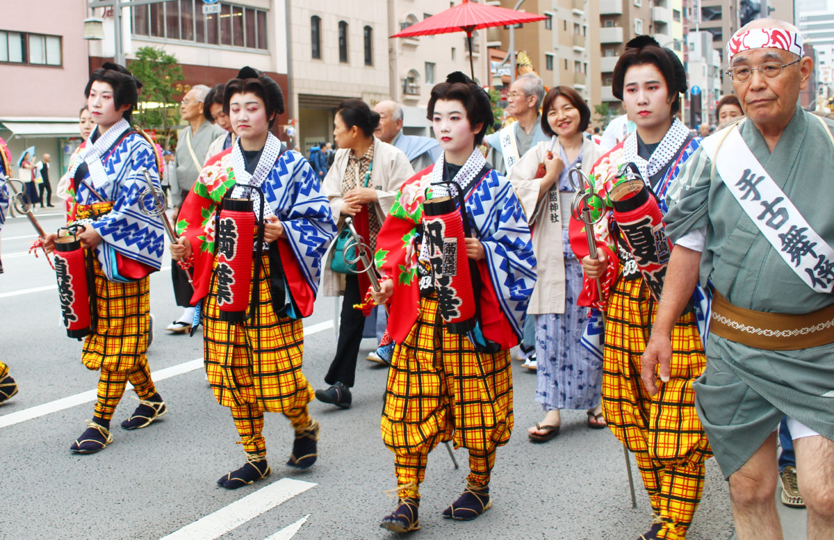 天狗に続いて手古舞連(てこまいれん)の皆さんが進んできます。鮮やかな色の衣装がきれいですね!