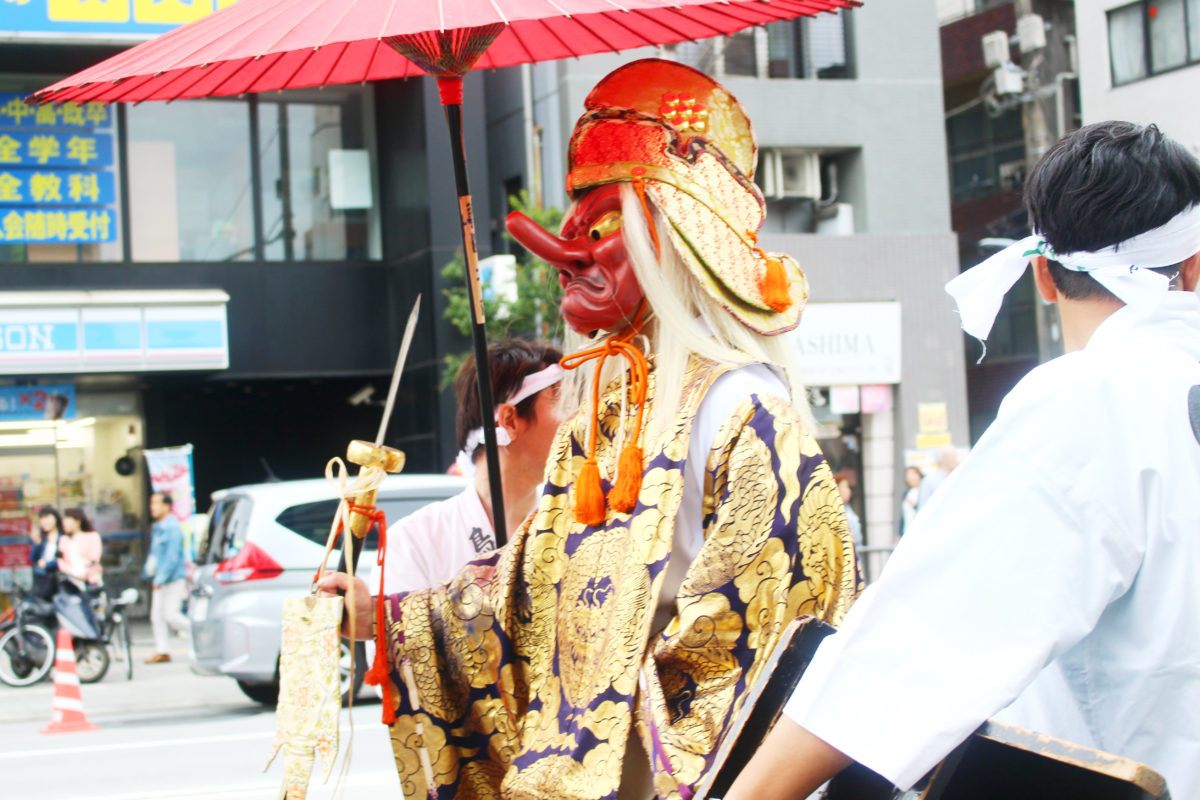 千貫神輿の前には長い行列が練り歩いていますその先頭をいくのがこちら、天狗(猿田彦)です!空高く伸びる鼻が凛々しいですね。