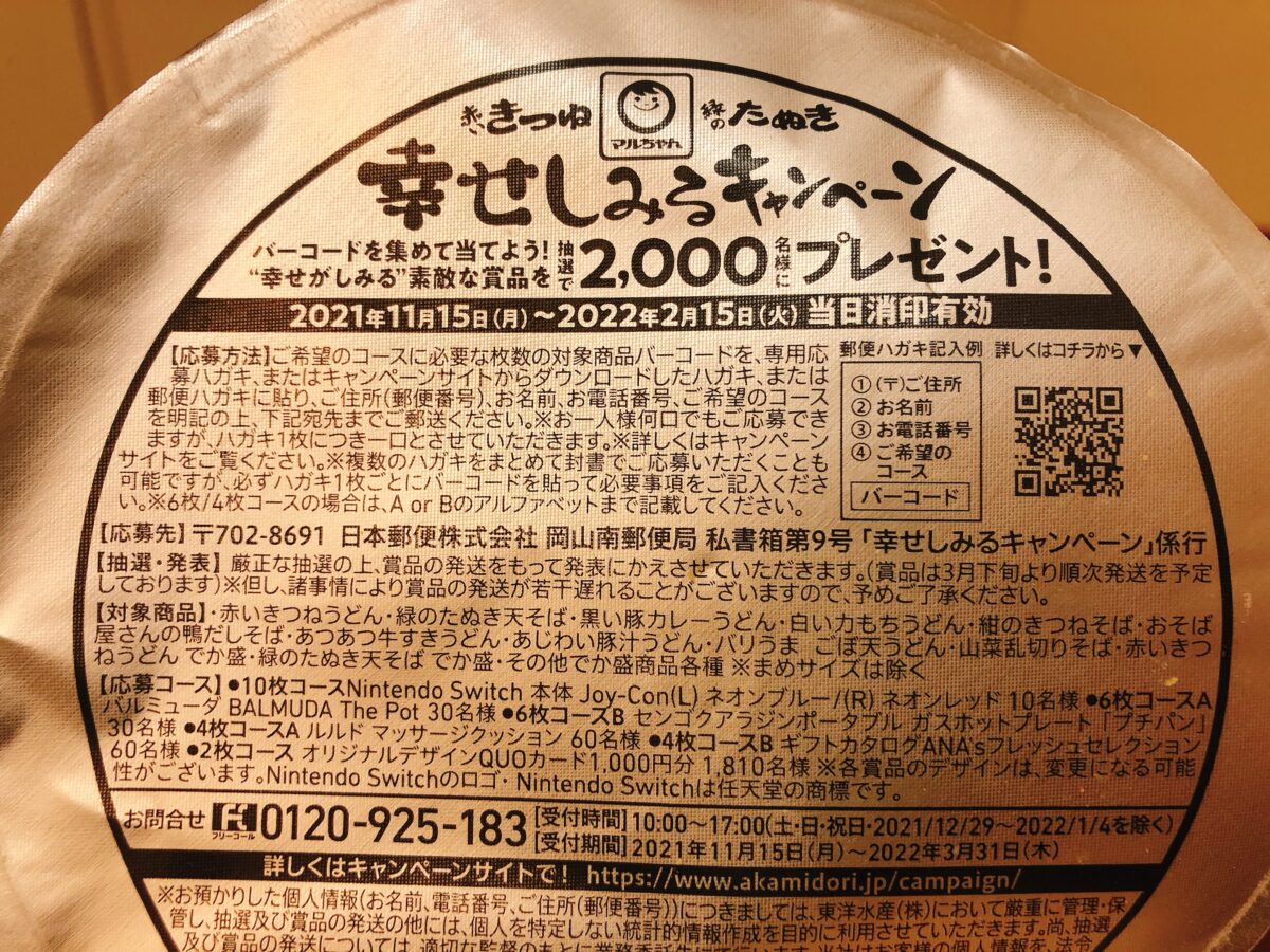 マルちゃん「赤いきつね」「緑のたぬき」をはじめとした対象カップ麺では、2021年11月15日から、2022年2月15日までの期間「幸せしみるキャンペーン」を開催中!欲しい商品に応募するために必要な枚数の商品バーコードを集めて、キャンペーンページからダウンロード可能な専用応募ハガキ、または郵便ハガキに貼り、お名前(フリガナ)、お電話番号、ご住所(郵便番号)、希望のコースを明記の上応募すれば、Nintendo Switchをはじめとした豪華景品が当たるかも!?お年玉気分でチャレンジしてみてはいかがでしょうか?