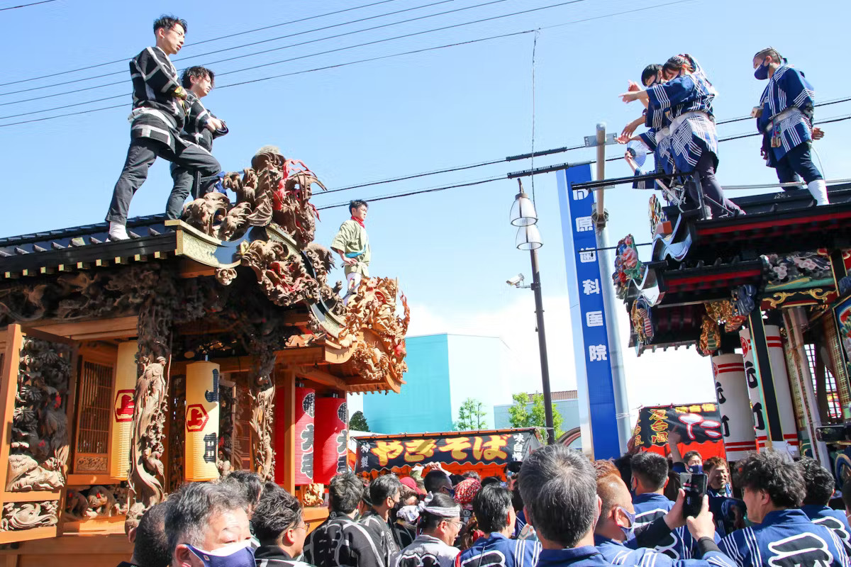 大田原市では、毎年4月の第3土曜・日曜日に「大田原屋台まつり」が開催されます。この祭りの見どころは、なんといっても屋台の「ぶっつけ」。9町それぞれが彫刻・漆塗りなどがあしらわれた豪華な屋台を繰り出します。そして19時頃には9台すべてが集まり、屋台同士をギリギリまで近づけて各町のお囃子を競います。