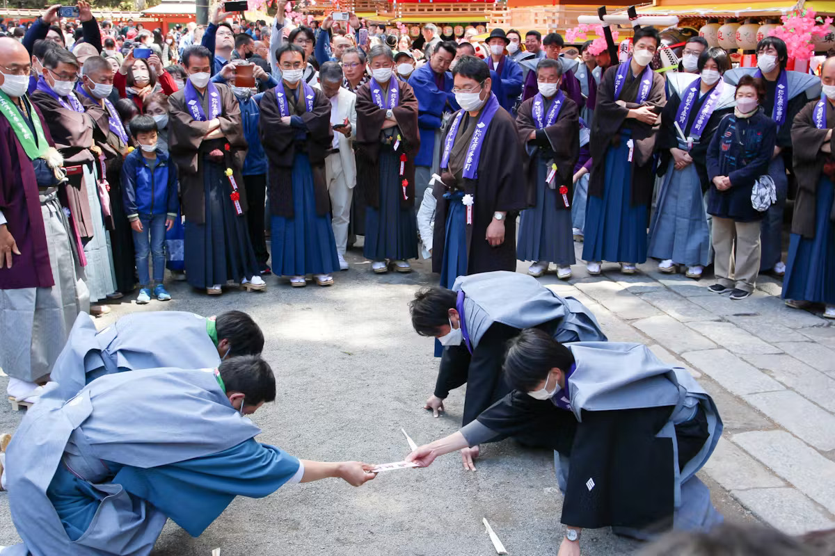 伝統を重んじる弥生祭では、すべての家体が到着すると町内同士の挨拶として「名刺交換」が行われるのも特徴です。正装をした男性らが、町名の書かれた名刺を受け渡す緊張感のあるシーンは、ここでしか見られない特別な瞬間です。