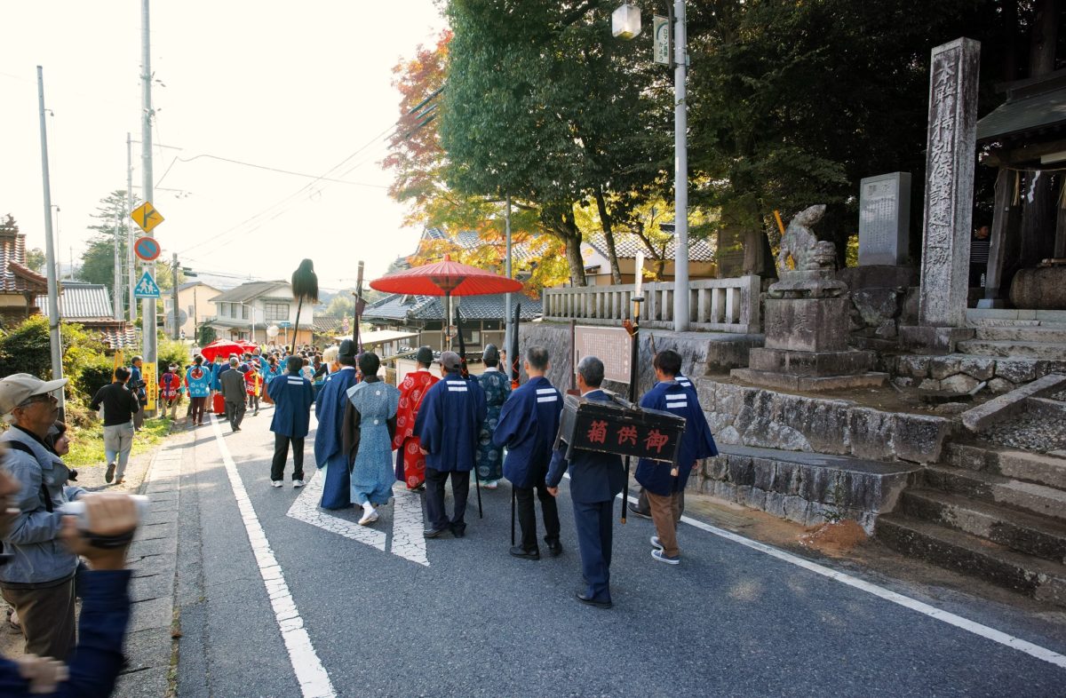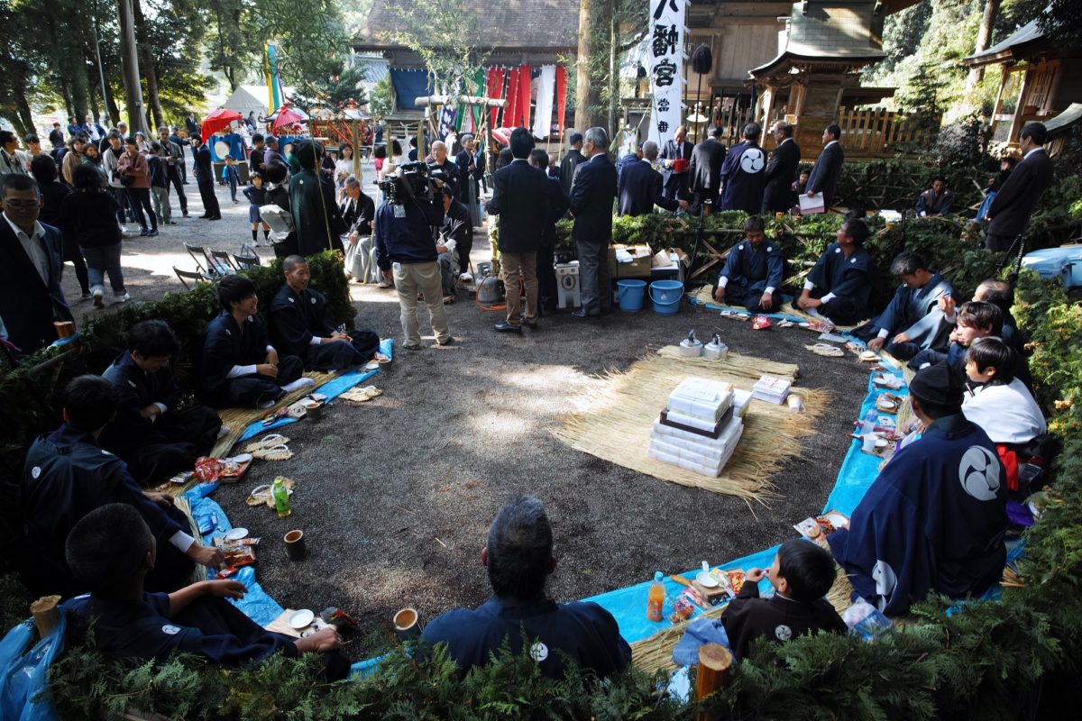 14時に御旅所へ行列で御神幸をします。2019年10月20日(日曜日)各家から白米1升を持参して「どぶろく」を仕込み20日頃で酒になるこの日に樽の口を開けて新酒を神様に供えて直会を開いて、口開けを行ったようです。