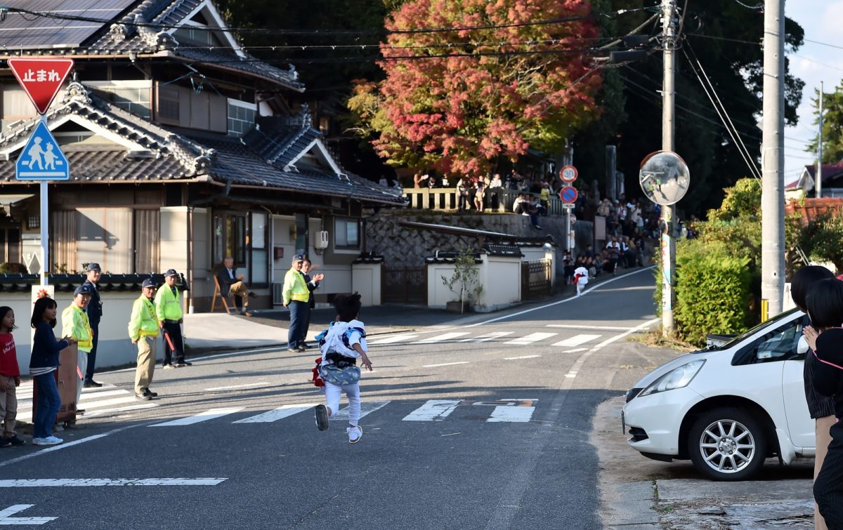 学年差を付けて競争です、吉川八幡宮で皆がまってます。