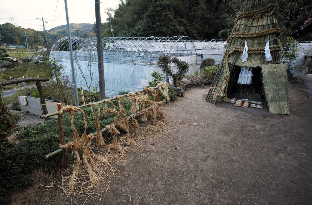 今回は祭りが終わって、当家の前庭に「波区芸」という特別な工作物を設けてるとお聞きしたので、当家さんの了解をえて、写真を撮らせて頂きました。この全体が波区芸といわれ神が降臨する神聖な室です。大祭中の最も重要で厳粛な祭事のようです。