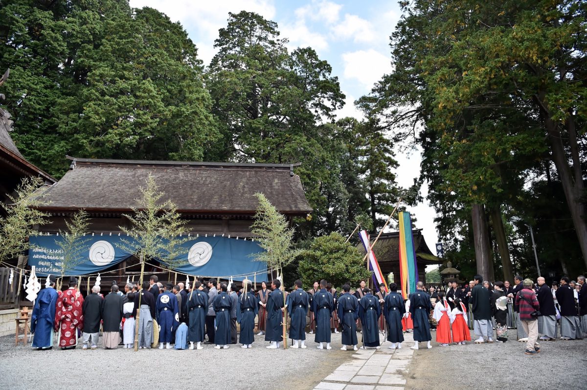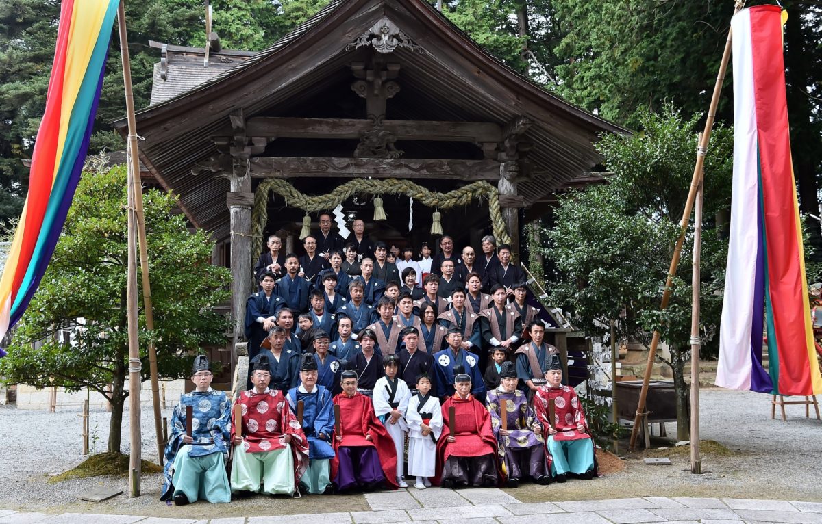 白装束の当番様を中心に、当主、太刀持、宮総代が祭りの安全や1年の感謝を願って祭りを盛り上げていきます。