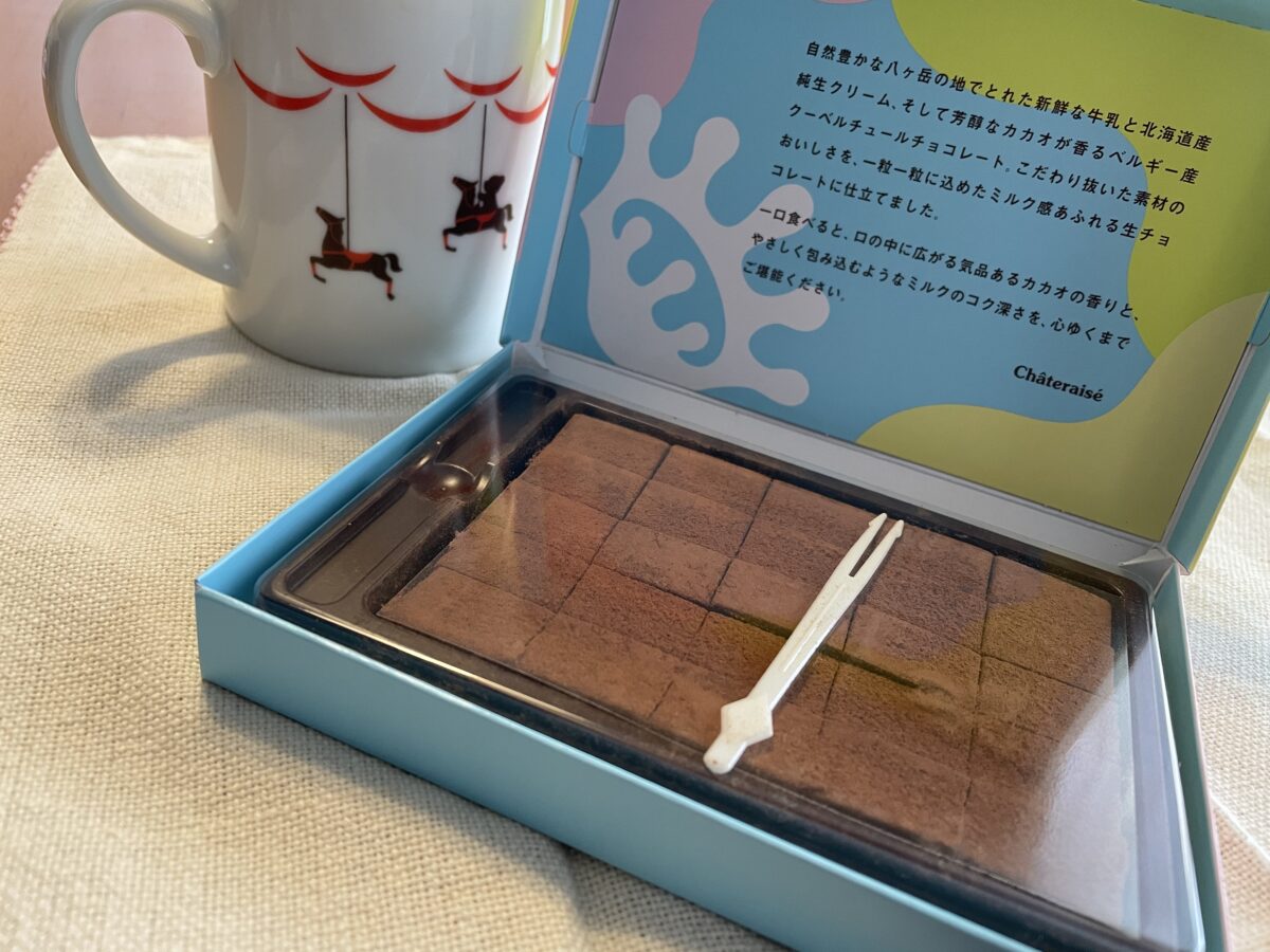 こちらは、自然豊かな八ヶ岳の地でとれた新鮮牛乳と北海道産純生クリーム、ベルギー産クーベルチュールチョコレートを使用した生チョコレート。こちらは、冷蔵品で販売されていました。