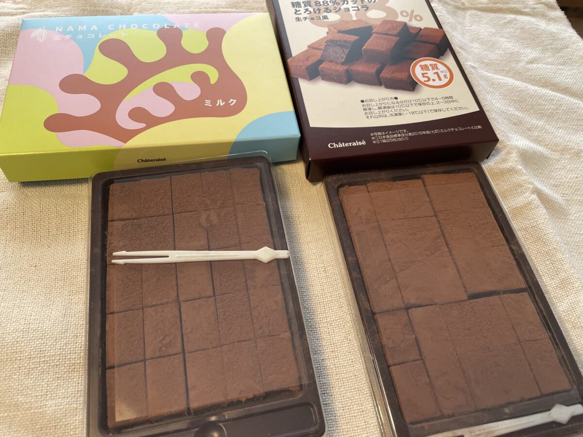 【糖質88%カットのとろけるショコラ】がとても美味しいことは分かりました!しかし、通常の「生チョコレート」と比べたらきっと違いがあるのではないか?と言う疑問があったので、シャトレーゼで販売されている【生チョコレートミルク 25個入・572円】と食べ比べをしてみました。