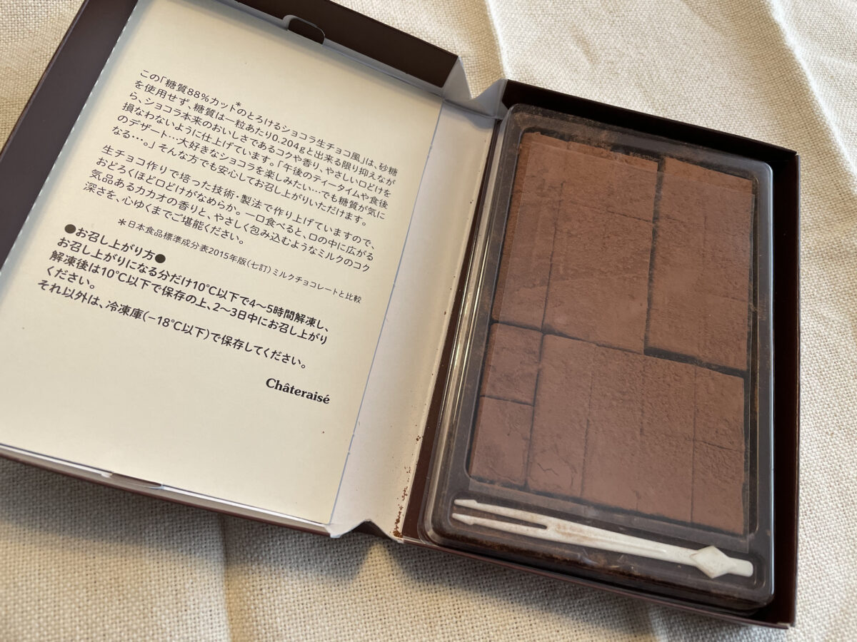 解凍した【糖質88%カットのとろけるショコラ】は、見た目は特に普通の生チョコレートと変わりはありませんでした。実際食べてみての第一印象は……普通の生チョコレートと違いが分からず!とても、くちどけがよく、カカオの香りもしっかり、口の中に広がりました。この美味しさで、糖質がカット出来るのなら、オススメ出来る一品だと感じました。