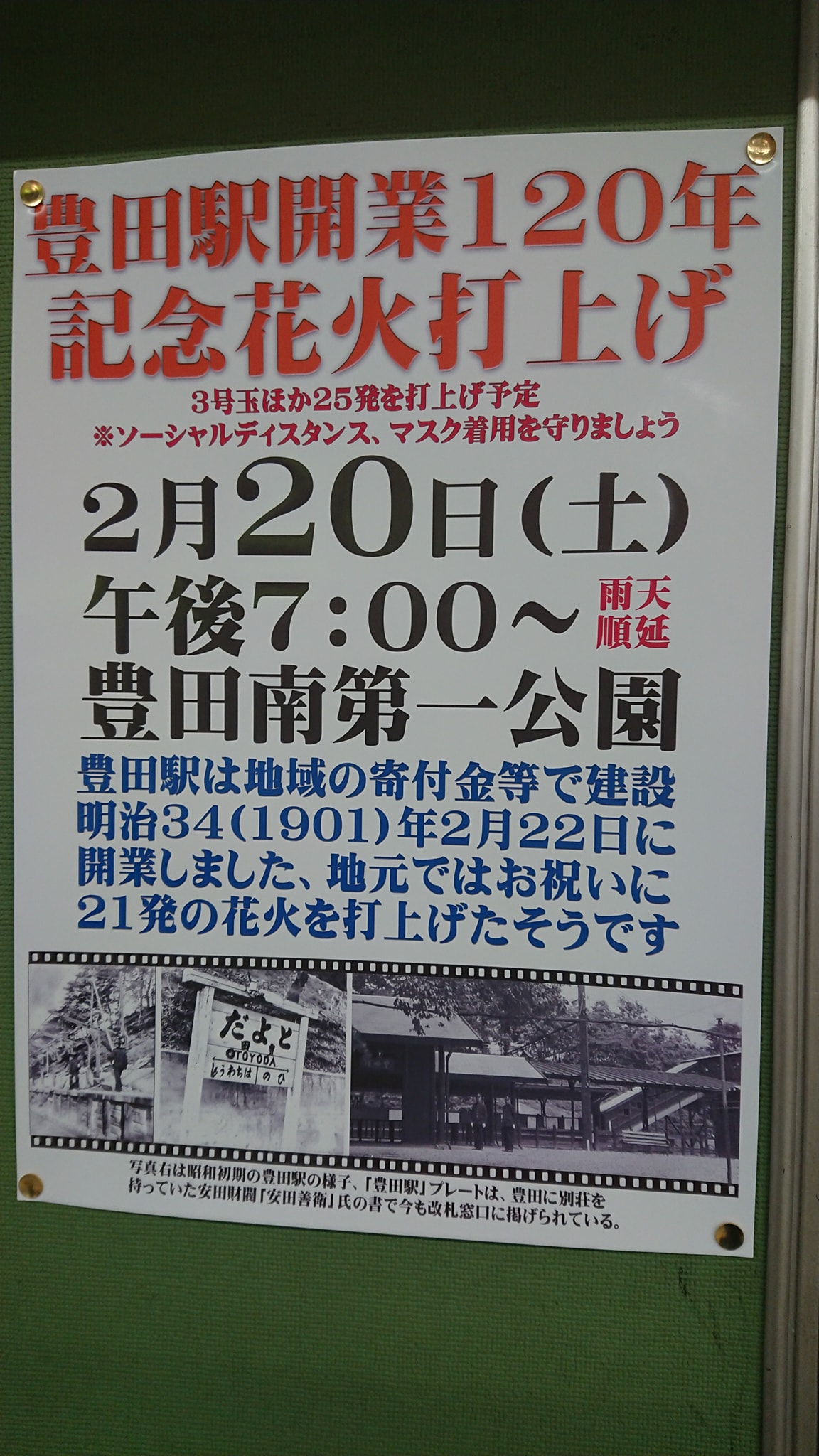 2月20日(土)、開業120周年を迎える豊田駅の開業記念花火に参加して来ました。1901年当時はお祝いとして、21発の花火を打ち上げたとのことですが、新型コロナ禍においても、みんなが楽しめるカタチで記念イベントを行っており、とても良かったなと思いました。今回はその様子をレポートいたします。