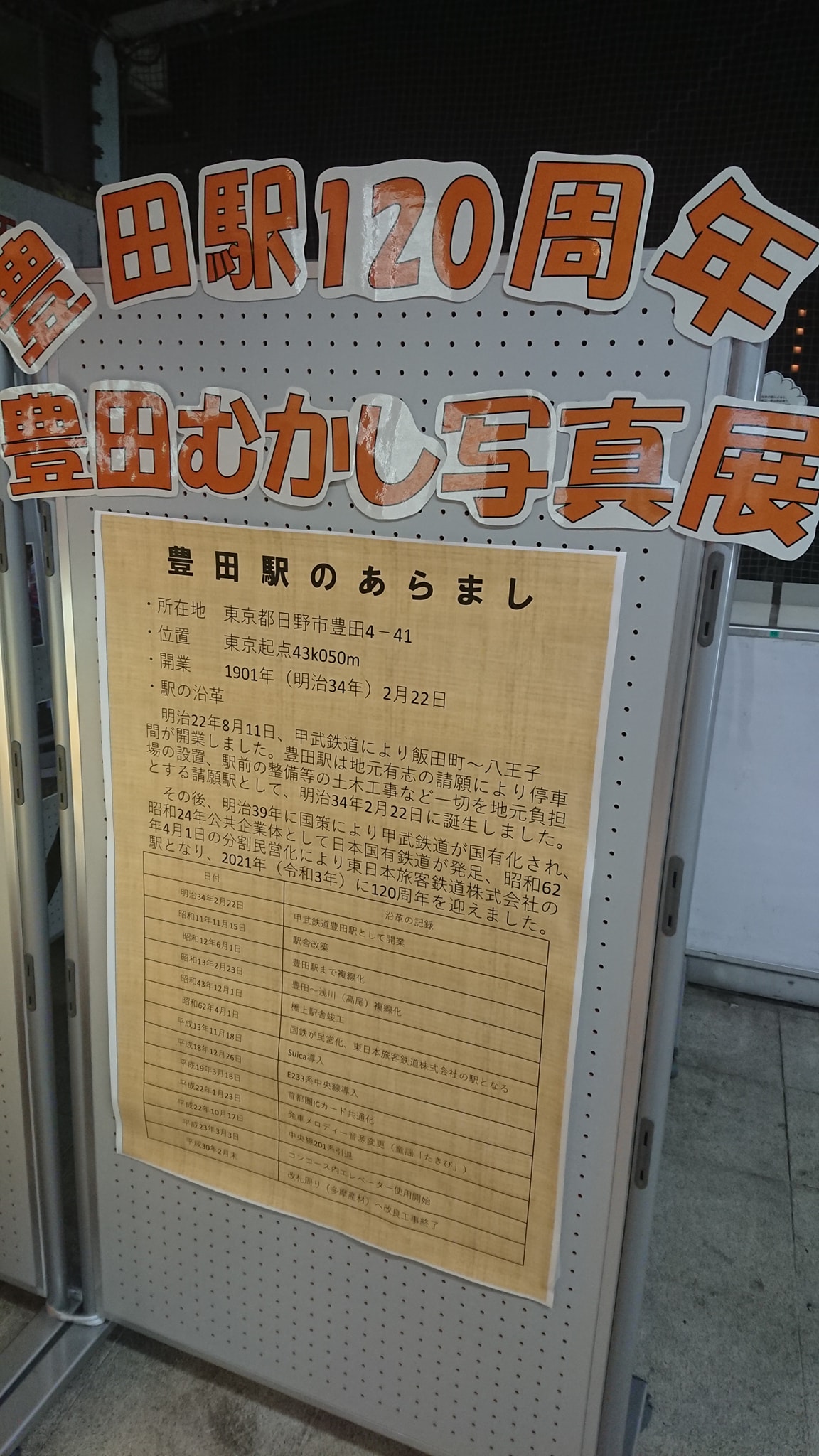 駅の南口には120周年の「豊田むかし写真展」が行われておりました。昔の写真と今の写真の比較がされていたり、昔から豊田駅付近に住んでいた方には、一般の来訪者以上に感慨深いものがあるのではないかと思いました。
