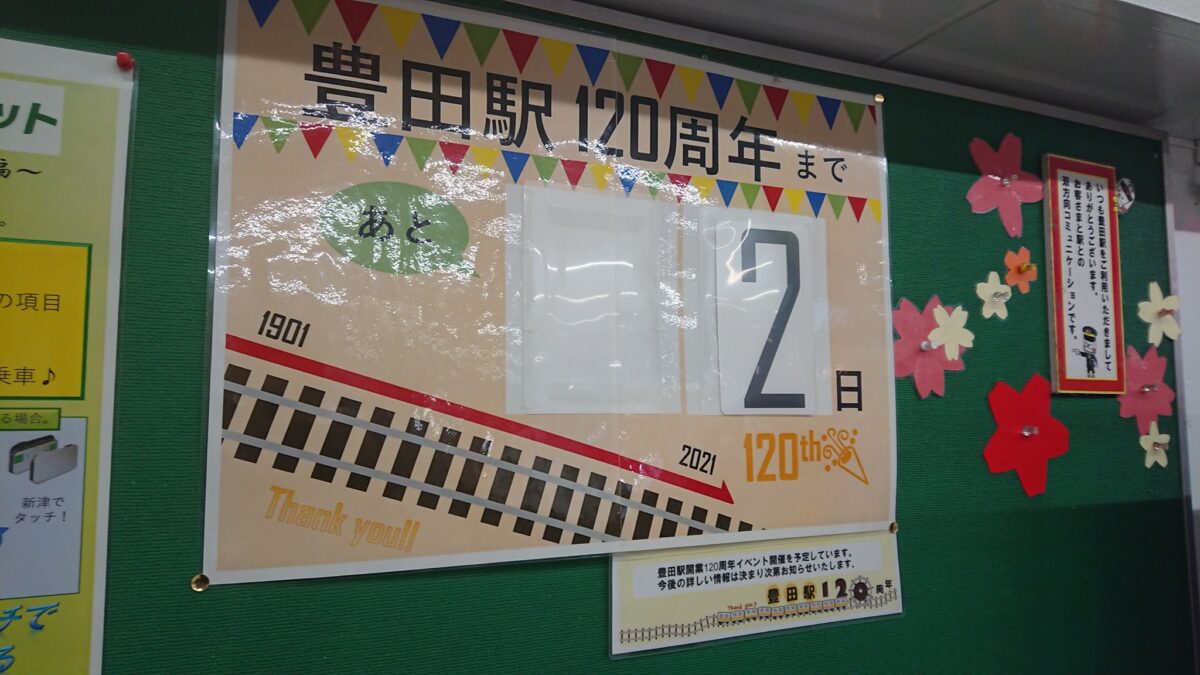 豊田駅を降りると、後2日で120周年というカウントダウンの案内が出ておりました。手作りで、丁寧に運営されていることが伝わってきます。