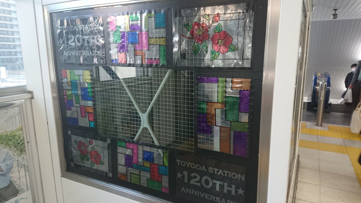 ステンドグラス風のデザイン作品。豊田駅120周年を盛り上げるよう掲示されております。