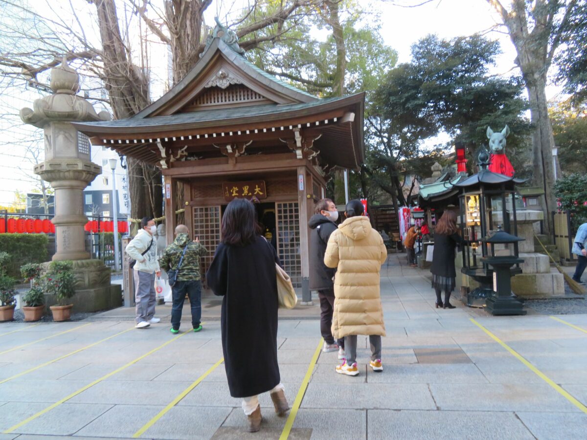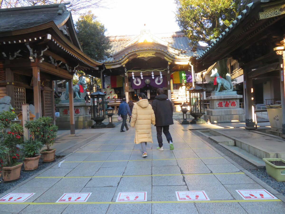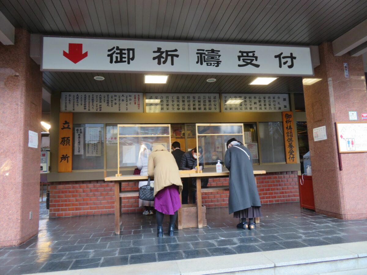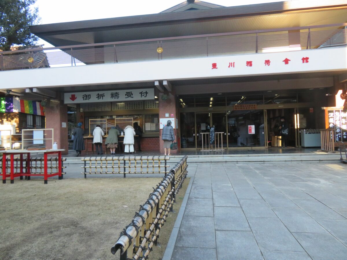 豊川稲荷東京別院の初午祭の祈祷場所は、山門の北に建つ稲荷別院会館です。初午の日には次々に受付窓口に祈祷を希望する人がつめかけます。初午祭の祈祷を終えると例年は赤飯を頂くことができるのですが、2021年は新型コロナウイルス感染防止のため赤飯の配布は行われませんでした。