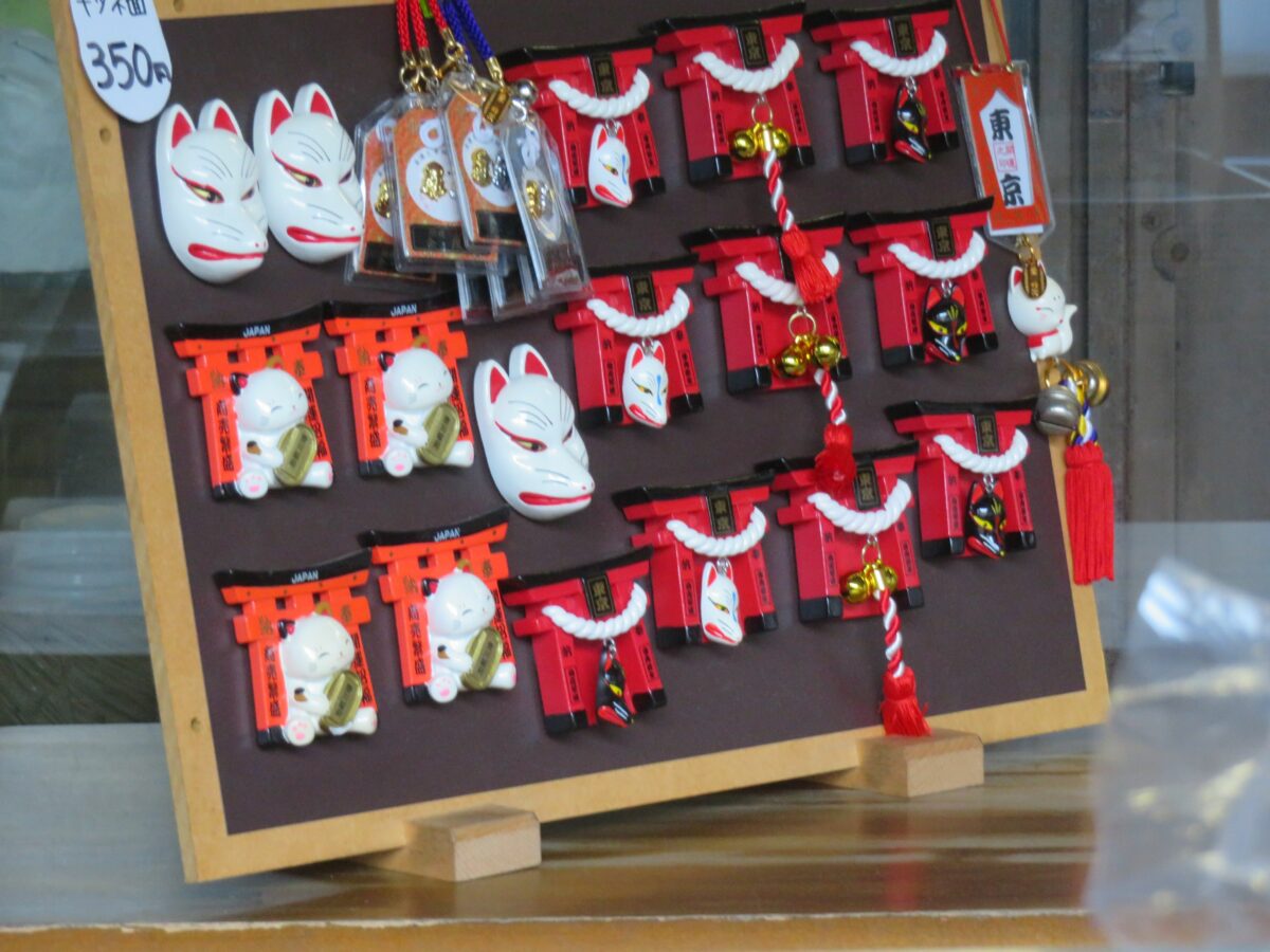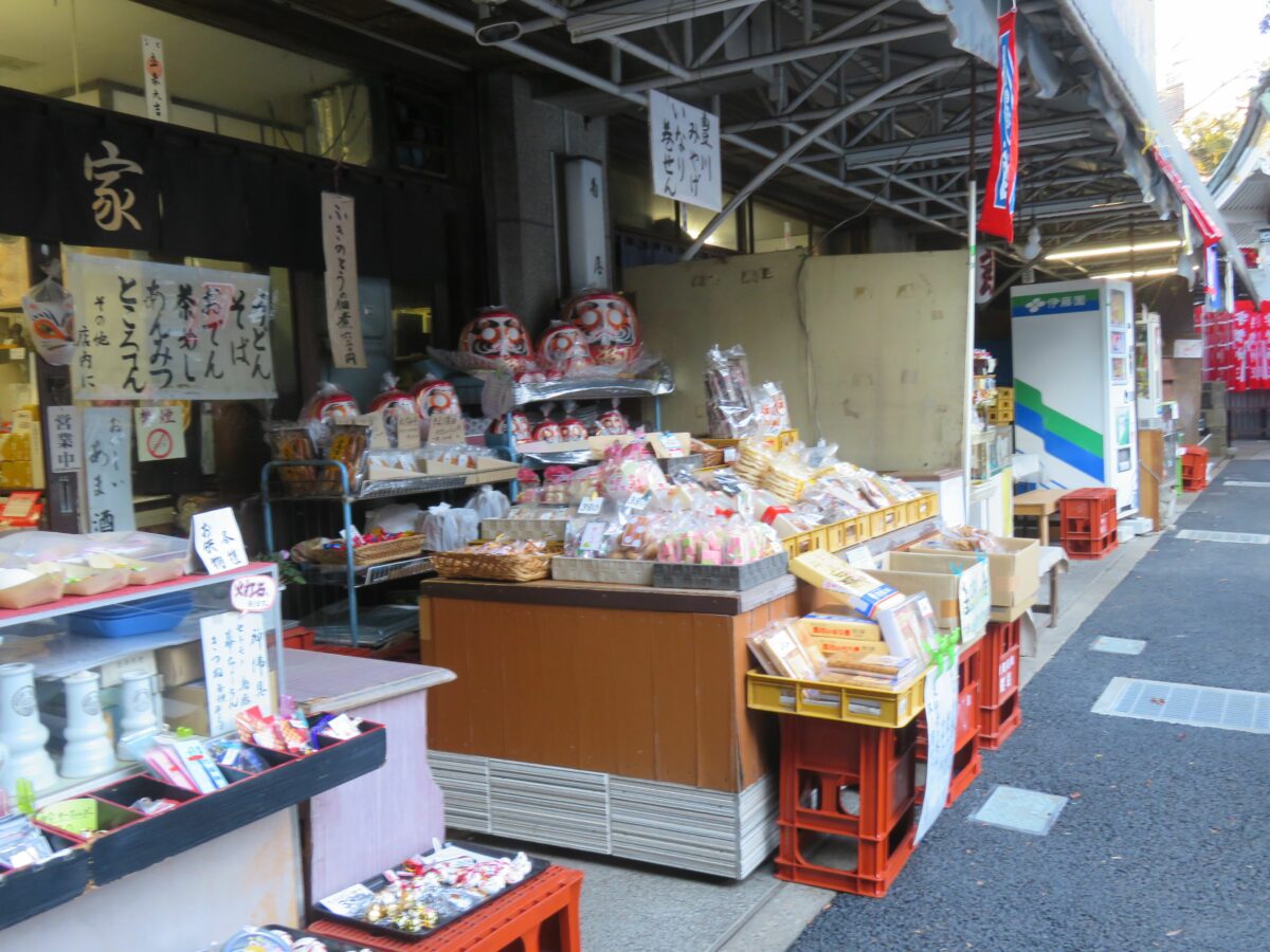 神社での参拝には供え物が欠かせないものでしょう。豊川稲荷東京別院では境内西の駐車場に添って数件の商店が軒を連ねています。各々の店舗では、供え物の他に縁起物、土産が揃っており、名物のいなりずしなどの軽食をとることもできます。初午の日に食べるいなり寿司は「初午いなり」と言われ、縁起が良いとされています。