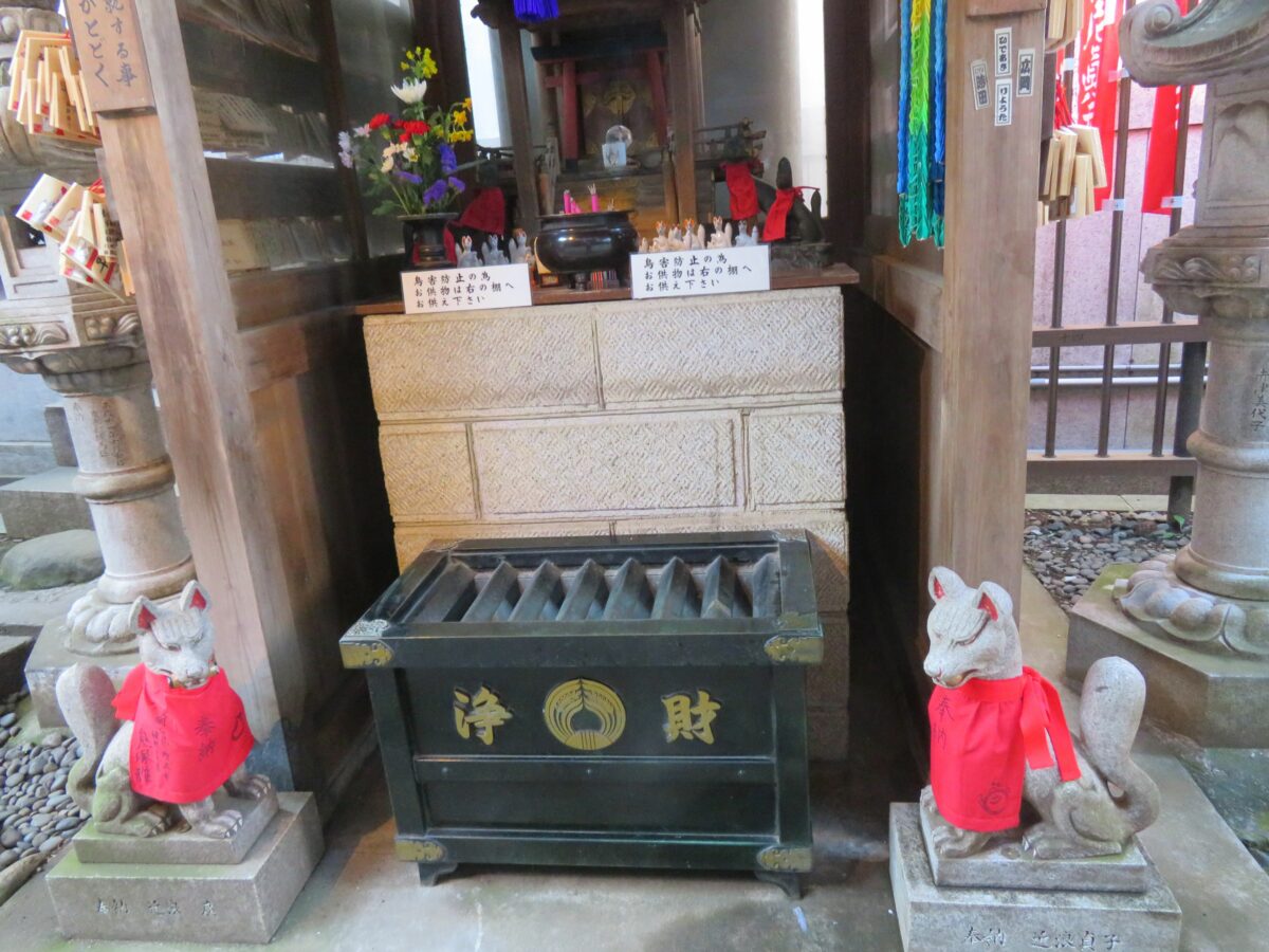 祈祷が行われる稲荷別院会館の西の境内には、本殿を中心として数多くの社殿がひしめき合っています。迷路のように細い通路が巡り、その両側にご利益の異なる神様が祀られています。順に参拝していけば、全ての願いが叶うかもしれません。境内には夥しい数の狐の像が設置されていますが、ゆるキャラの「いなりん」が装いに変化を加えています。